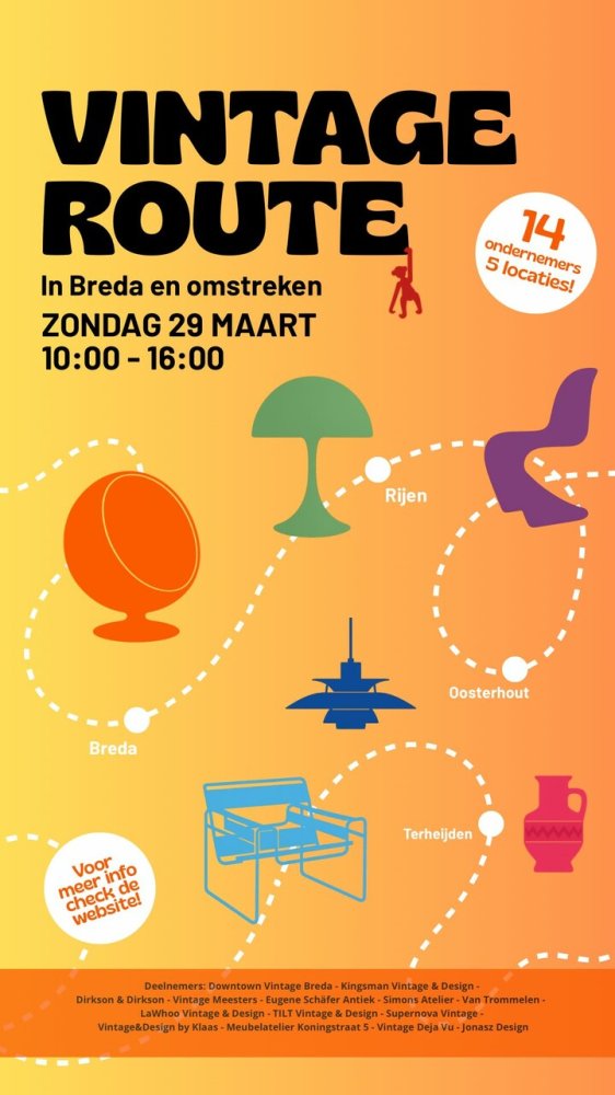 Mocht je de route liever anders doen kan dat natuurlijk, elke locatie is tijdens de VINTAGE ROUTE open van 10:00 tot 16:00.