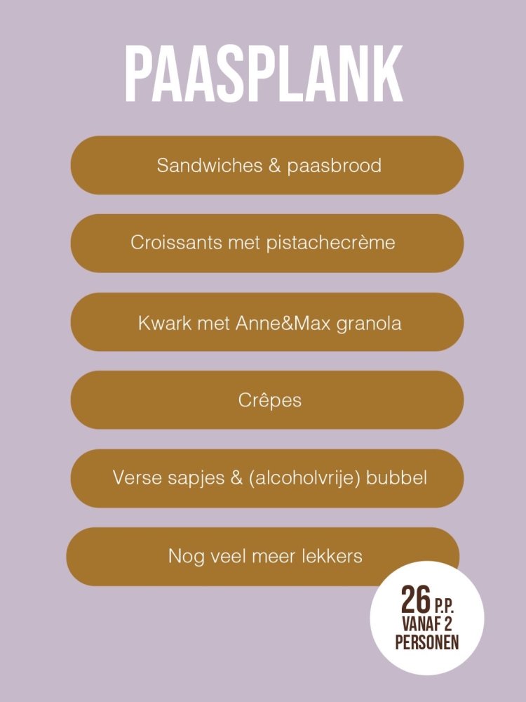 Op beide Paasdagen kun je hier genieten van een heerlijke brunchplank. Op deze plank zit alles waar jij op je Paasdag van wil genieten: paasbrood, yoghurt met vers fruit, roerei, crêpes, verse sapjes en nog meer lekkers 🥐🫐☕
