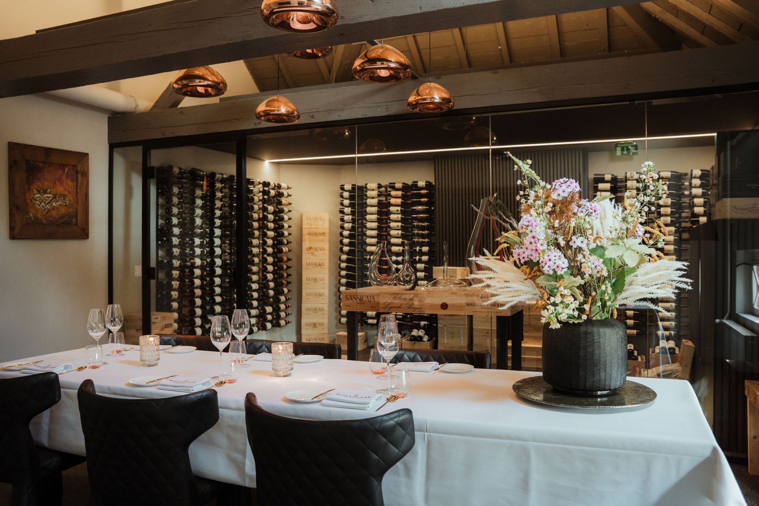 Heeft u een intieme setting nodig voor uw vergadering of privé-lunch of -diner? Onze Wijnkamer op de eerste verdieping is de ideale ruimte voor gezelschappen tot 12 personen. De sfeervolle Wijnkamer biedt rust en privacy en kijkt uit op onze prachtige inloop-wijnklimaatkast. Hier ziet u een gedeelte van onze wijnvoorraad met een selectie bijzondere wijnen die wij met zorg bewaren. Hierdoor is het de perfecte keuze voor belangrijke besprekingen of een speciale gelegenheid met een select gezelschap. Een proeverij voorafgaand aan uw lunch of diner in deze ruimte behoort uiteraard ook tot de mogelijkheden. Wij bespreken graag uw wensen.