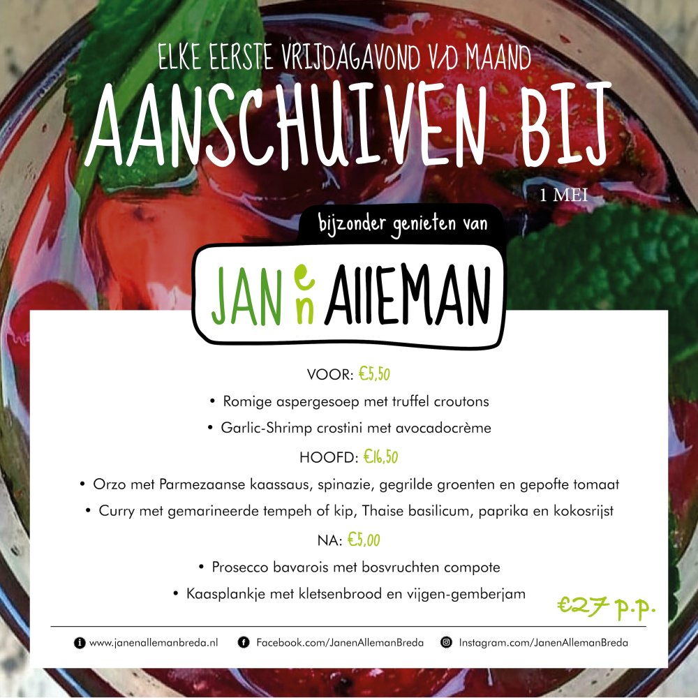 Je kunt bij ons elke eerste vrijdagavond van de maand aanschuiven vanaf 17:00 (de keuken sluit om 20:00). Het hele menu kost €29,- maar het is ook mogelijk de gangen los te bestellen. Reserveren kan via de telefoon 076- 7634055 of mail naar info@janenallemanbreda.nl.