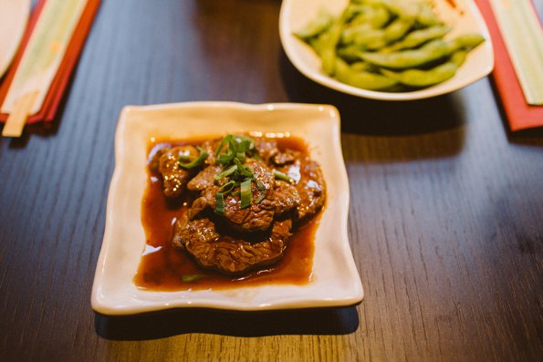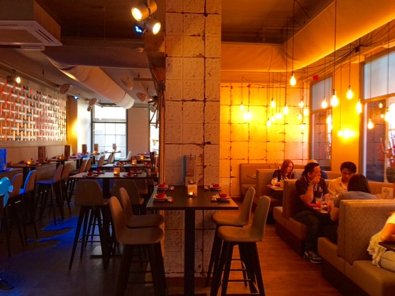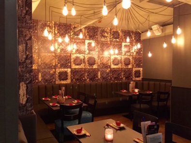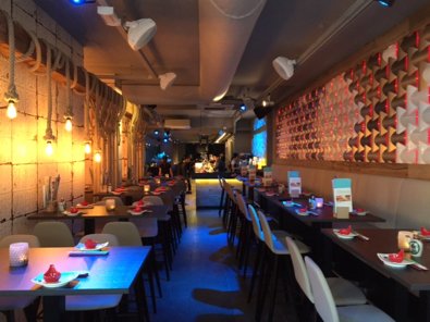 Bij binnenkomst werden we direct vriendelijk ontvangen door het personeel en uitgenodigd om een rondje door de zaak te lopen. De zaak heeft een hippe en warme uitstraling gekregen, met veel gezellig zitjes om te loungen. Het is een mooie combinatie van oosterse en westerse invloeden geworden. Opvallend is dat de zaak voor naar achteren steeds donkerder wordt. Helemaal achterin heerst er daardoor een intiemere sfeer. De sfeer kan ook sterk worden bepaald door de verschillende led wanden. De wand voorin bestaat uit een soort schubben die licht doorlaten, “de eerste in Nederland” volgens Jun.