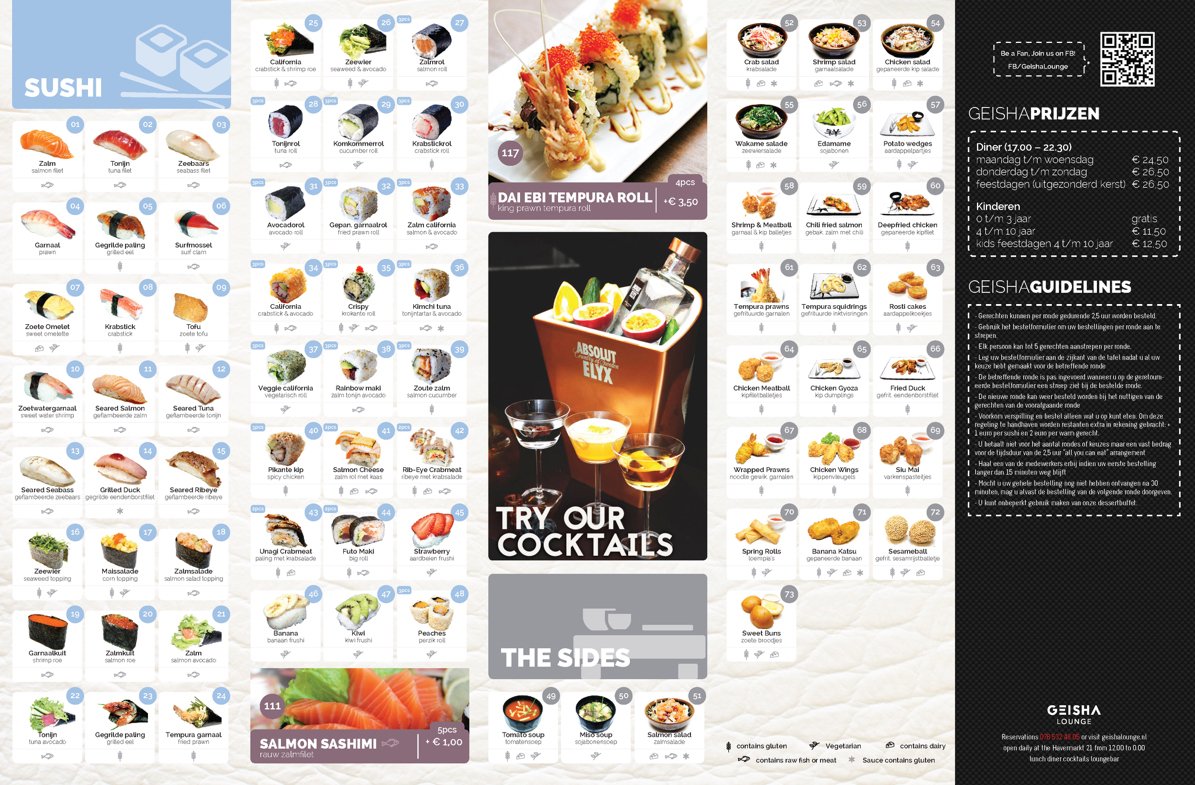 De kaart bestaat uit exclusieve sushi gerechten, grill en diverse vlees- en visspecialiteiten. De meeste gerechten vallen binnen het all-you-can-eat concept, daarnaast zijn er een aantal à la carte gerechten die in royale proporties worden geserveerd. Geisha Lounge biedt ook diverse soorten noodles en lunch. Alle gerechten worden met de hand bereidt en naar eigen recept. De chef kok is de vader van Jun, die al 20 jaar in de keuken staat. De kosten voor een diner bedragen €24,50 en €26,50 in het weekend. Dit is inclusief een klein buffet met desserts. Ter introductie ontvangen alle gasten in de maand juli 10% korting op de rekening!