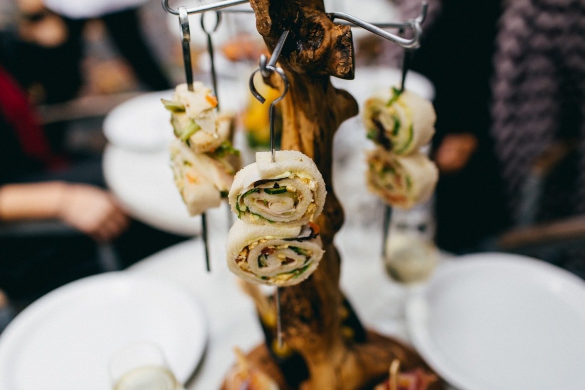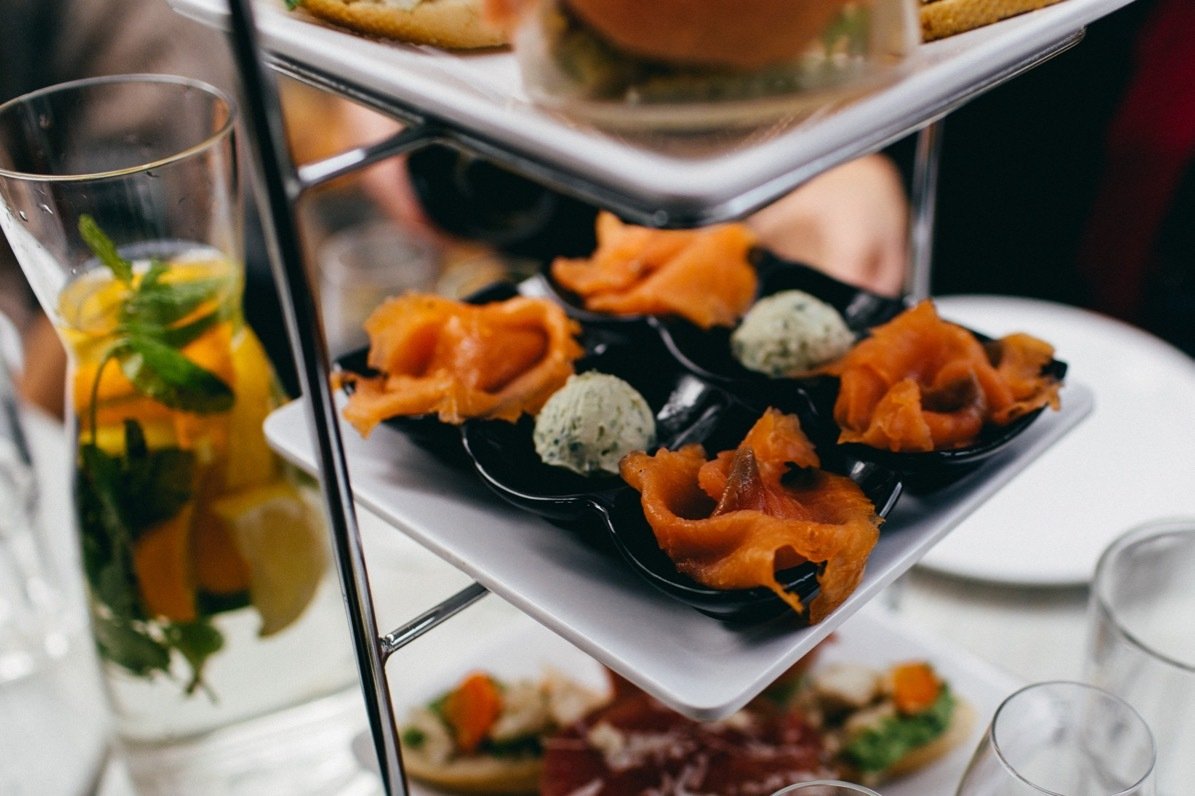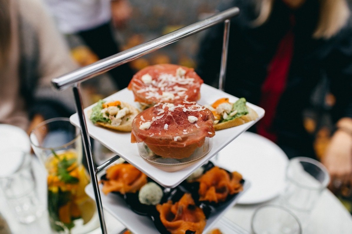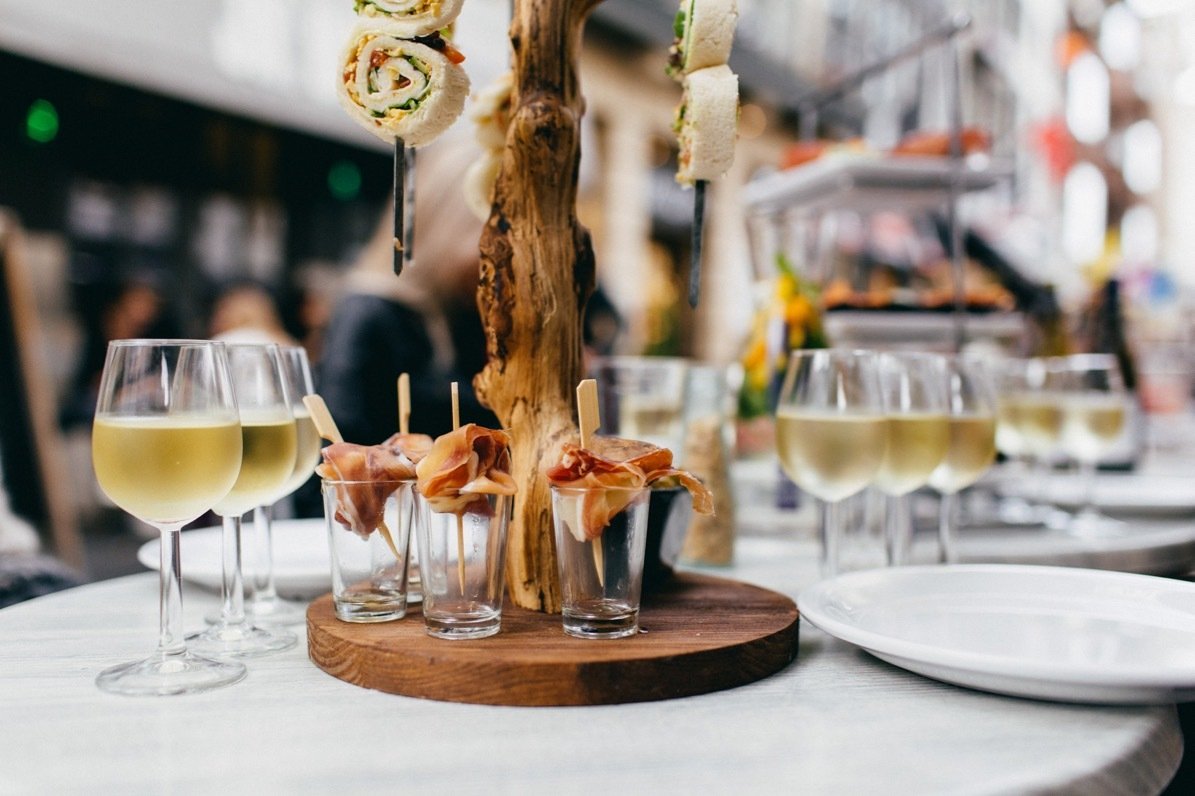De gerechten werden in drie rondes geserveerd; twee keer hartig en één keer zoet. De eerste ronde bestond uit lichte gerechtjes met voornamelijk vis. We proefden onder andere een crouton met tonijnsalade, een roosje gerookte zalm met verse kruidenkaas, een soesje met geitenkaasmousse en bladerdeeg met kabeljauw tapenade. Hierbij werden drie witte wijnen geschonken; een Pinot Blanc Alsace Ribeauville uit Frankrijk, een Sauvignon Blanc Loire Destinea uit Frankrijk en een Verdejo Rueda Ramon Bilbao uit Spanje.