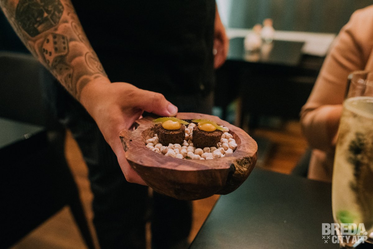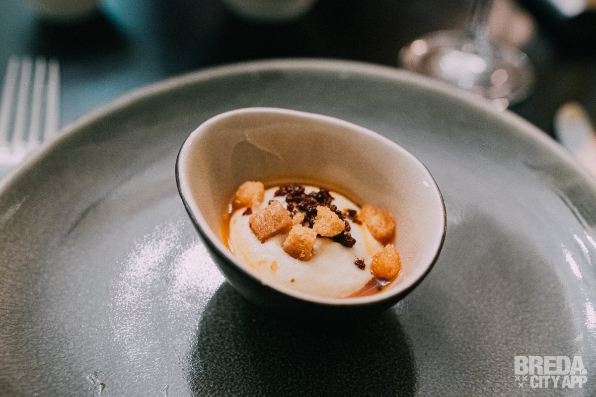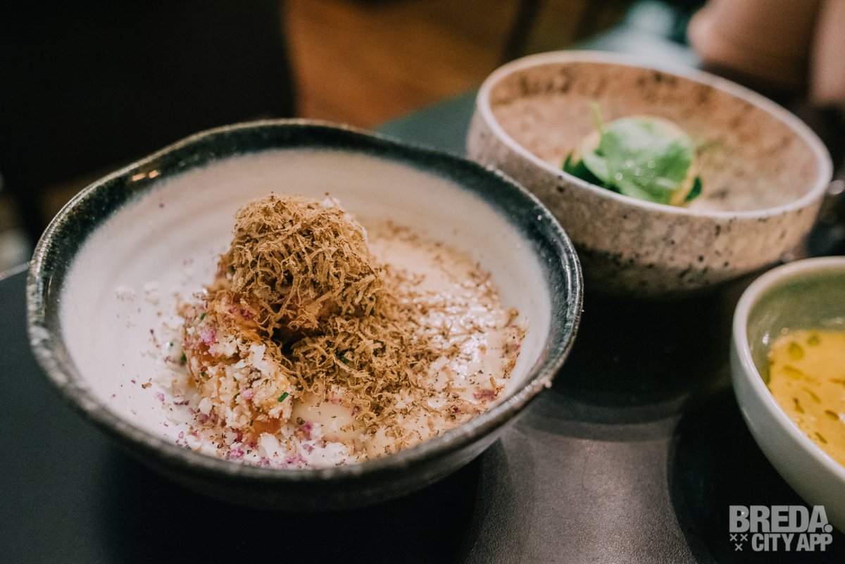 We genieten nog na van de eerste gang als de tussengerechten op tafel verschijnen. We starten met een gehaktbal iberico met een vulling van kaas. De structuur van de gehaktbal is te vergelijken met bloemkool en de gehaktbal is afgetopt met verse truffel en gesmolten eendenlever. Het vlees is ontzettend mals en goed op smaak.