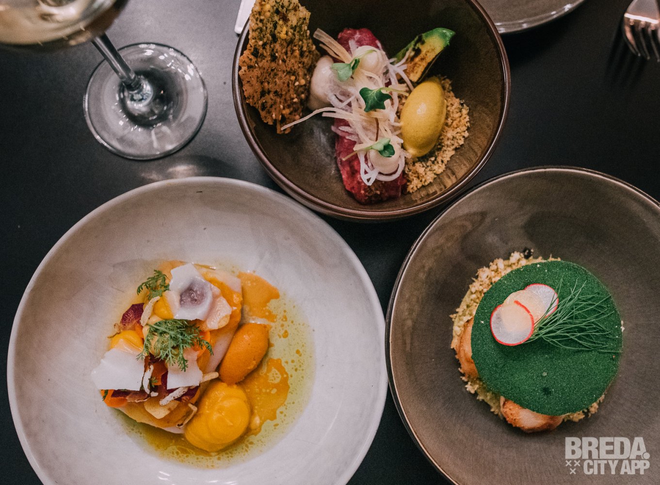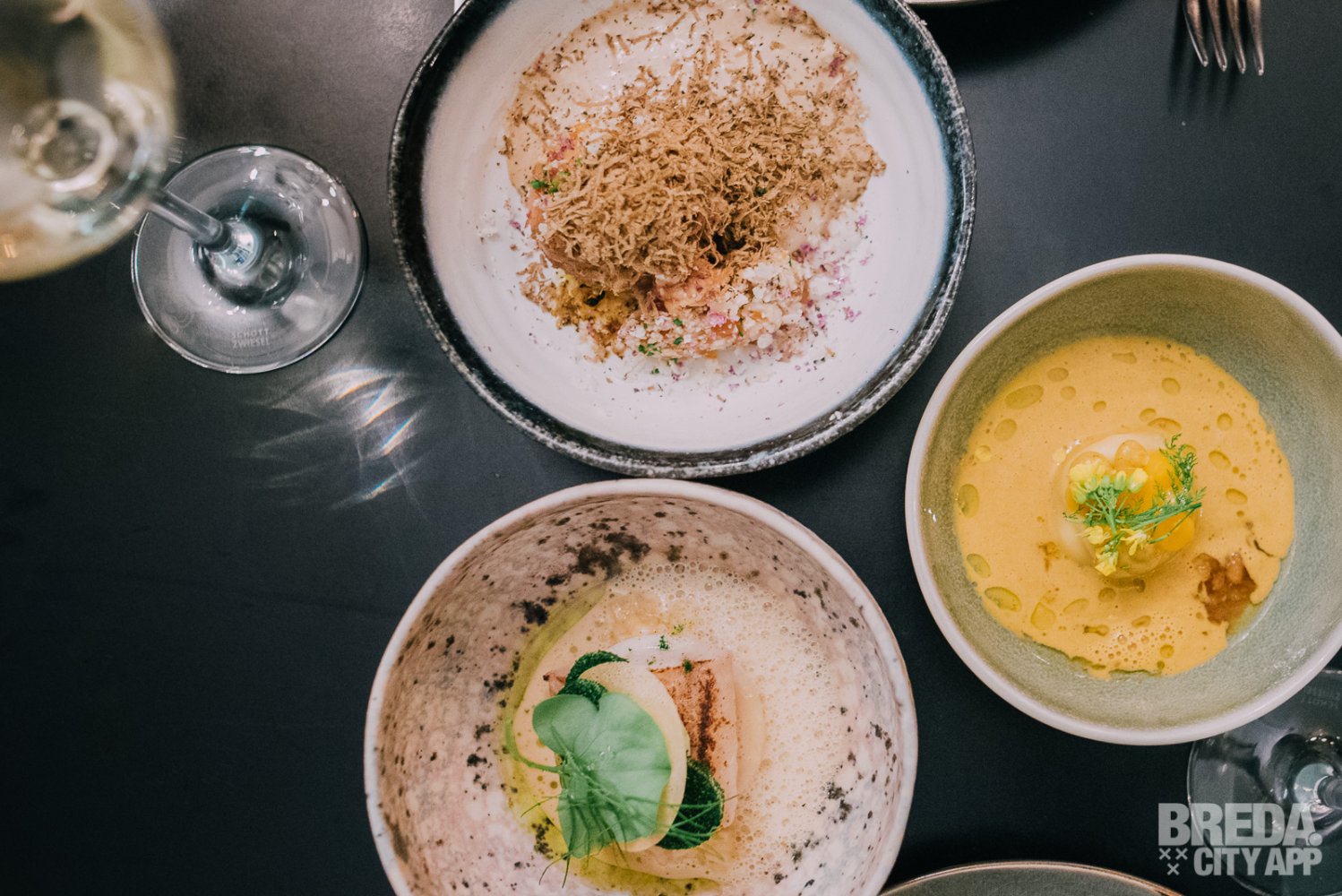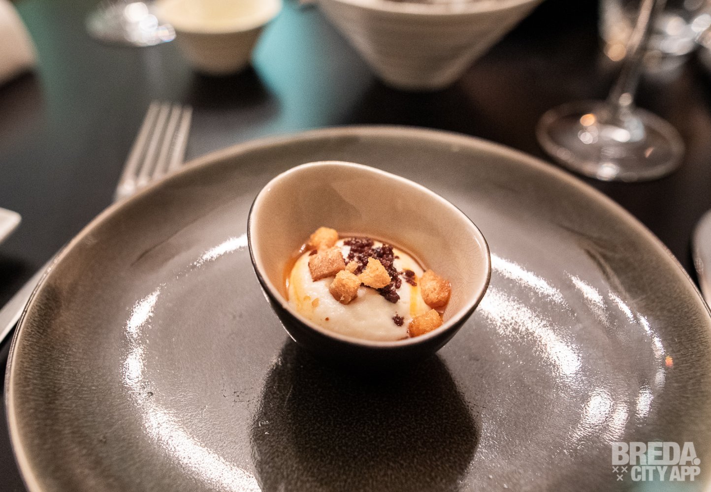 We genieten nog na van de eerste gang als de tussengerechten op tafel verschijnen. We starten met een gehaktbal iberico met een vulling van kaas. De structuur van de gehaktbal is te vergelijken met bloemkool en de gehaktbal is afgetopt met verse truffel en gesmolten eendenlever. Het vlees is ontzettend mals en goed op smaak.