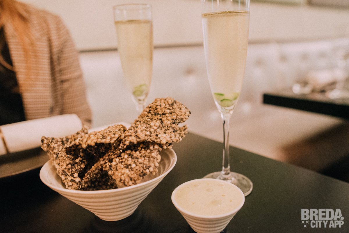 Bij binnenkomst worden we vriendelijk ontvangen door eigenaresse Wendy. We nemen plaats aan een mooi tafeltje in dit sfeervolle restaurant. De avond trappen we meteen feestelijk af en we beginnen met het huisaperitief: prosecco met komkommer. Het ziet er niet alleen heel mooi uit, maar zo smaakt het ook. Verrassend lekker! De frisse smaken van de komkommer passen perfect bij de licht zoete smaak van de prosecco. Daarnaast genieten we van de huisgemaakte crackers met sesam en tapioca. De mousse van kaffierlimoen zorgt voor een goede match.