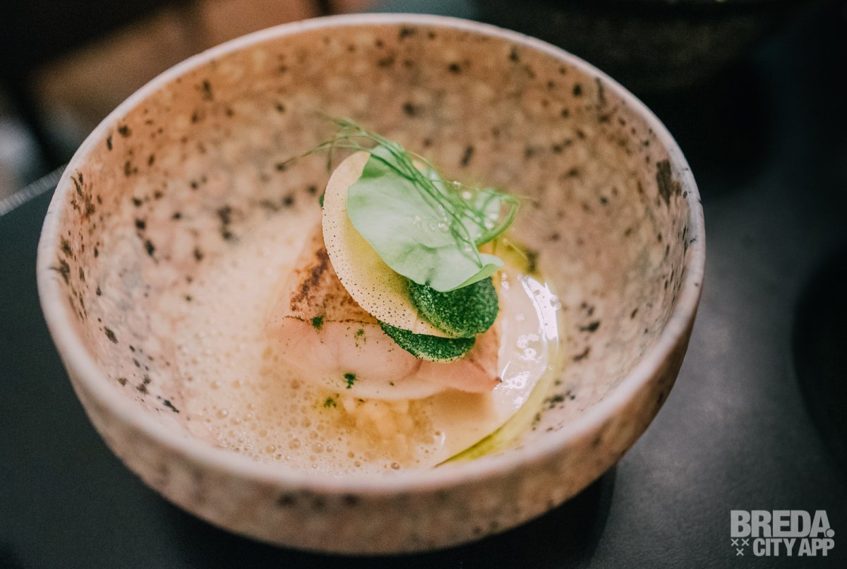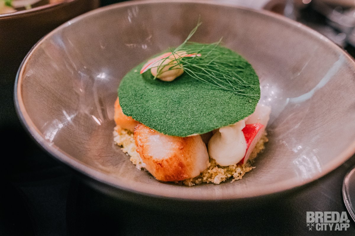 Het tweede gerecht wat we proeven is de coquille. Afgetopt met diverse radijsjes, verschillende soorten mayonaise op basis van coquille, citrus en tijm en daarbij een avocado crème met wasabi. Onder de gebakken coquilles ligt een carpaccio van coquille. De coquilles zijn precies zoals ze horen te zijn: lekker romig en zacht!