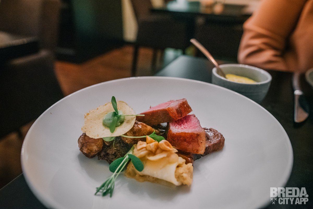 Tussendoor kunnen we het niet laten om de kalfsentrecote en gelakte kalfssukade alvast te proeven. Beide stukken vlees zijn goed gegaard en lekker mals. De entrecote is daarnaast ook nog eens heel mooi rood van kleur. Het gerecht is afgemaakt met beukenzwammen, aardpeer, duxelles dragon, cannelloni van knolselderij en hazelnoot. We krijgen er bearnaisesaus bij geserveerd.