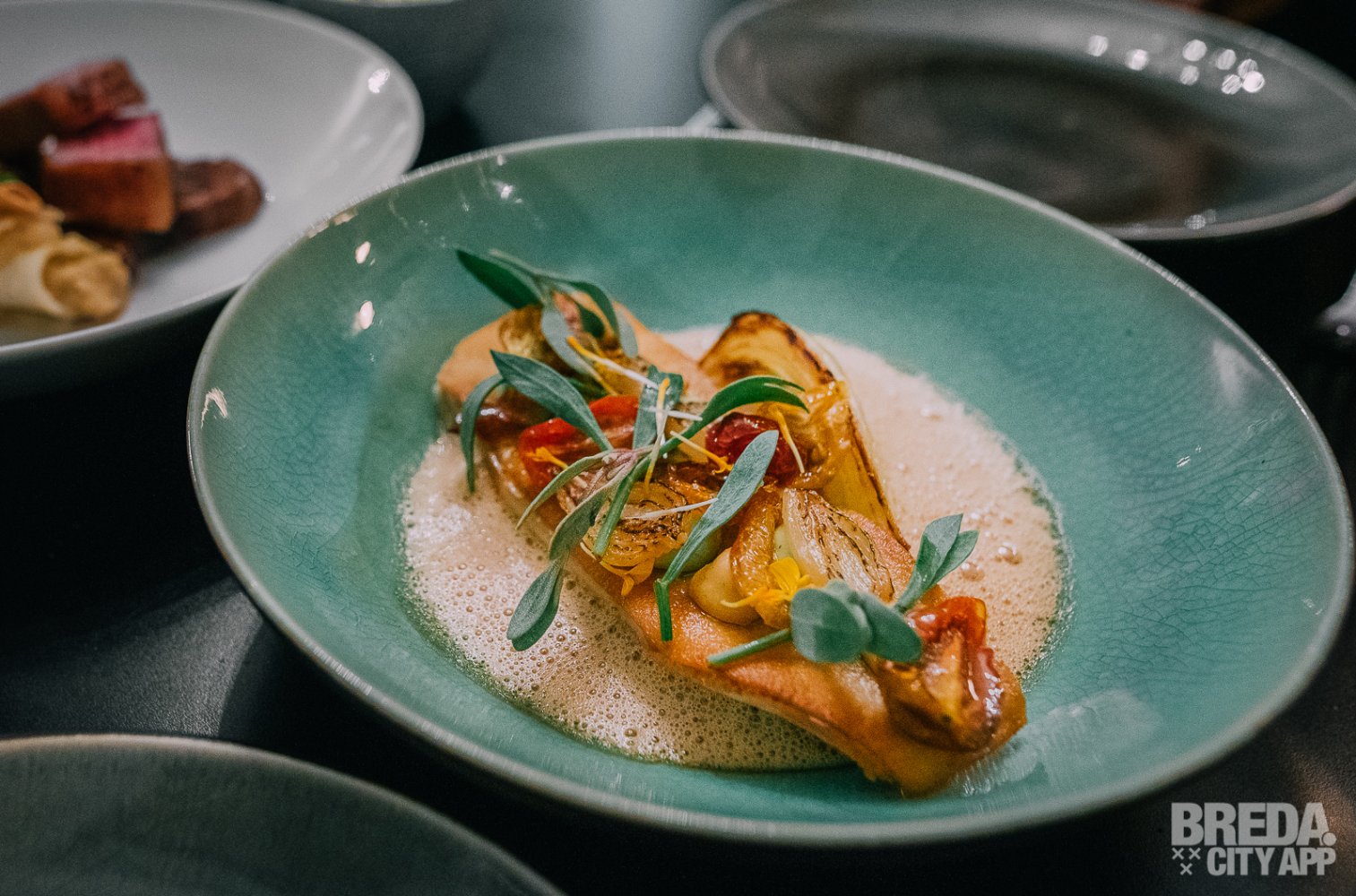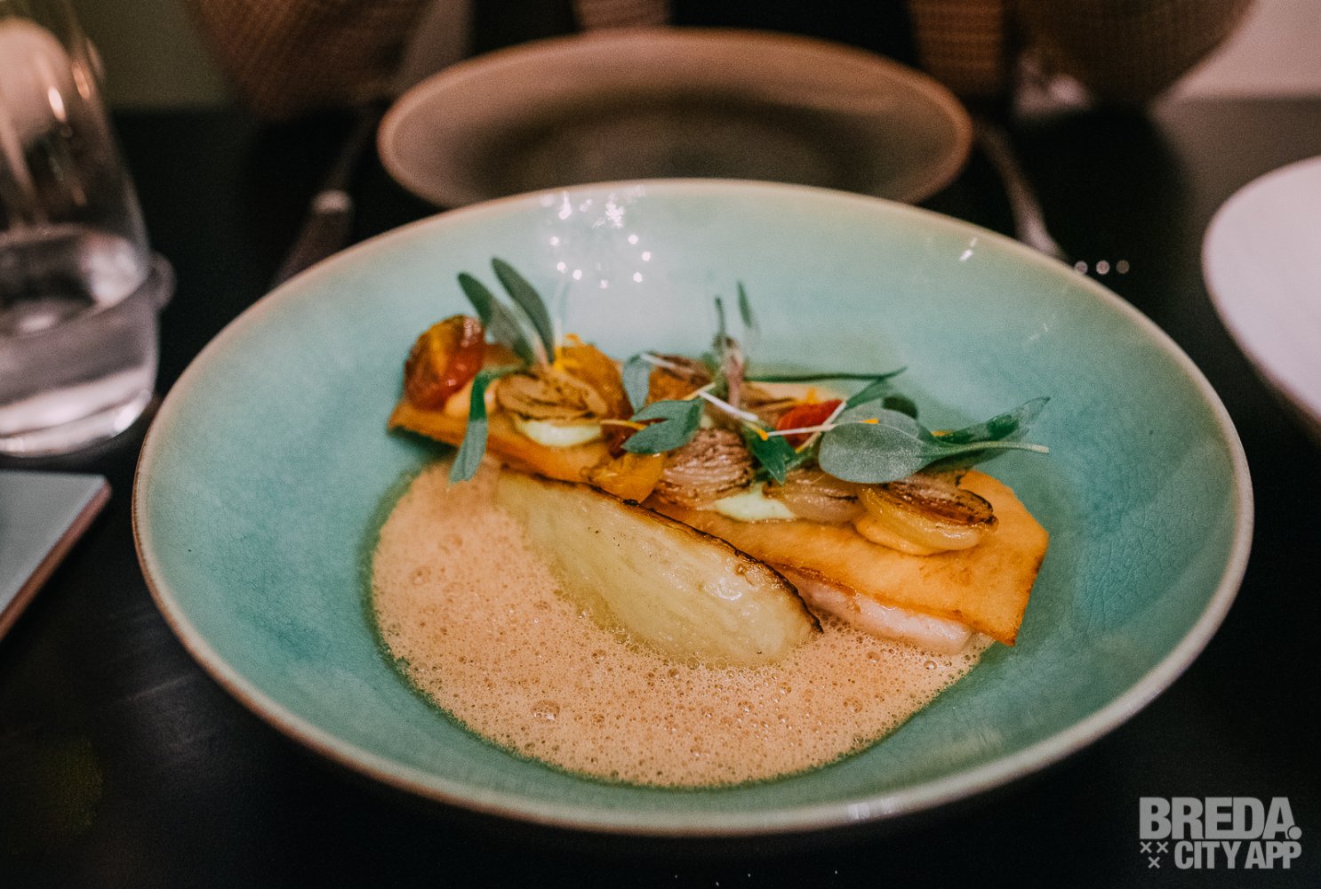 De tijd tussen de verschillende gangen en gerechten is precies goed en niet veel later worden de hoofdgerechten geserveerd. Het eerste gerecht is een gerecht van toen: zeebaars gebakken op melba toast. De combinatie klinkt misschien apart, maar is écht heerlijk! Dit is tot nu toe onze favoriet van alle gerechten. De schuimige bouillabaisse met gekonfijte tomaat, venkel en zeegroente zorgen voor een mooi geheel.