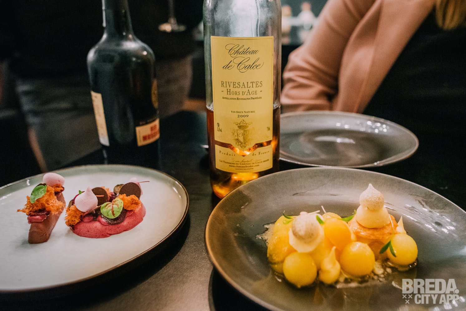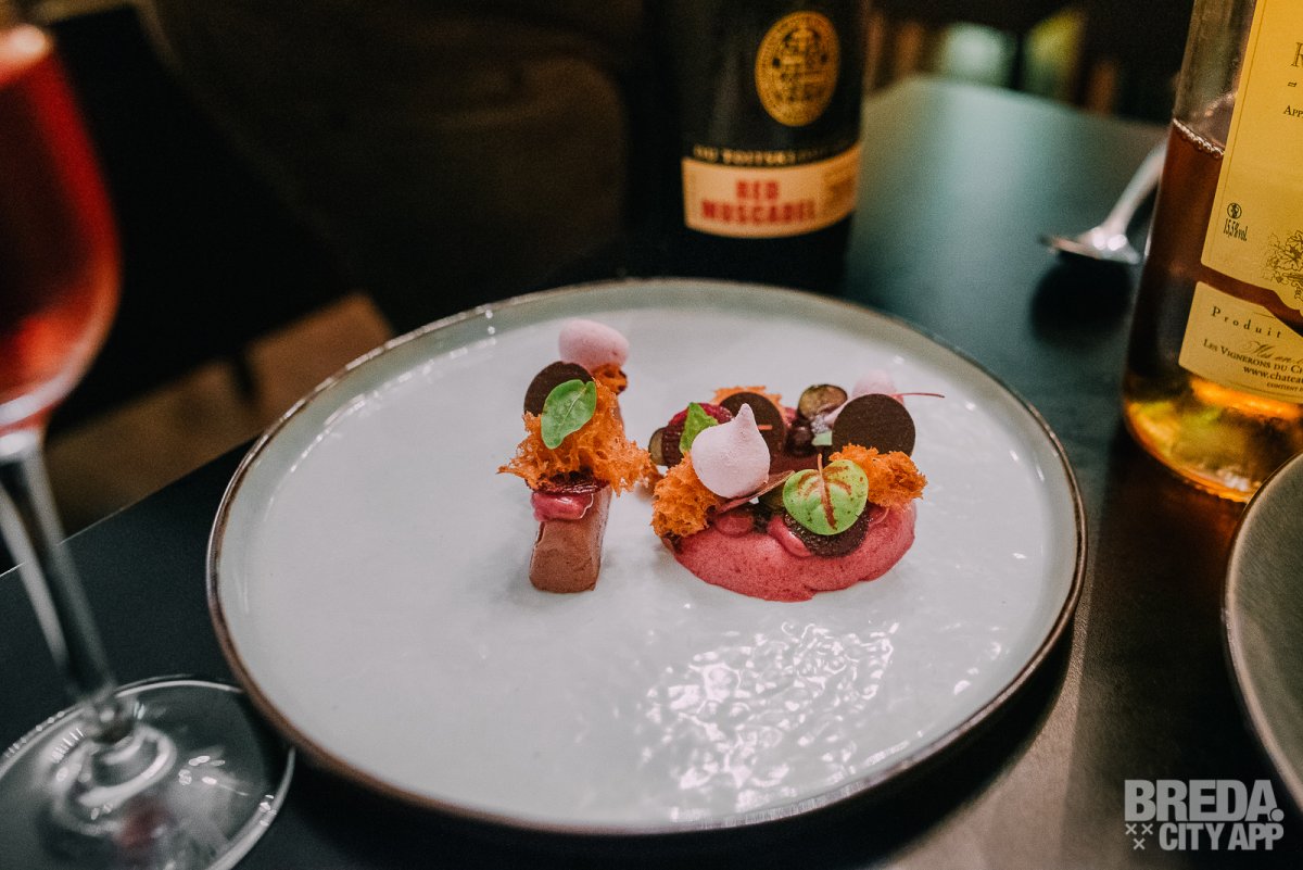 Zoals Wendy ons al vertelde is dit dessert zwaarder van smaak dan het vorige. De 1 is gemaakt van donkere chocolade, de 0 van framboos. De zwarte bes, rode biet en de schuimpjes maken het tot een mooi geheel. Vooral de combinatie met de rode biet is verrassend lekker! Hierbij drinken we een Red Muscadel van Du Toitskloof uit het jaar 2016.