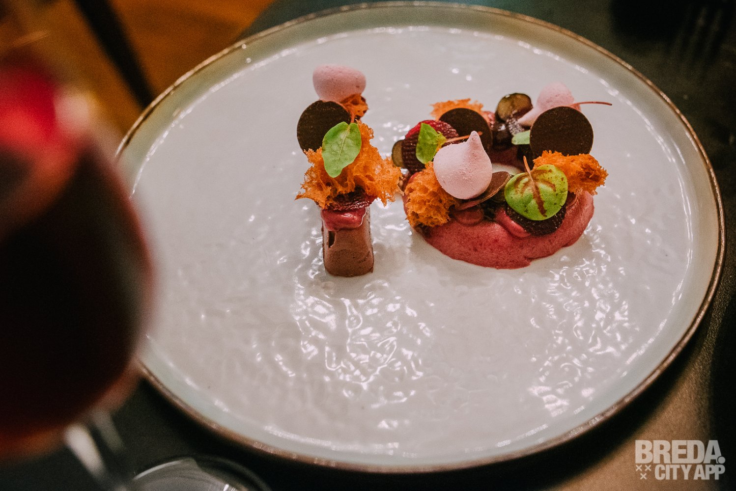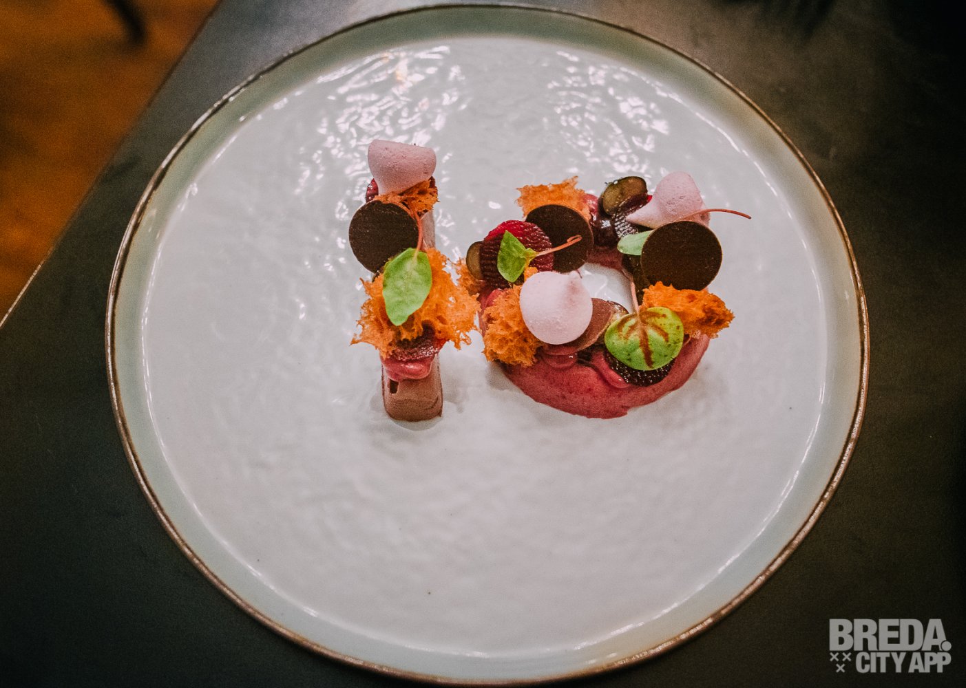 Het spektakelstuk viel ons natuurlijk meteen op: het gerecht bestaande uit chocolade en framboos, zwarte bes, rode biet en schuimpjes in de vorm van een 10. Wat een passende manier om dit mooie jubileummenu af te sluiten!
