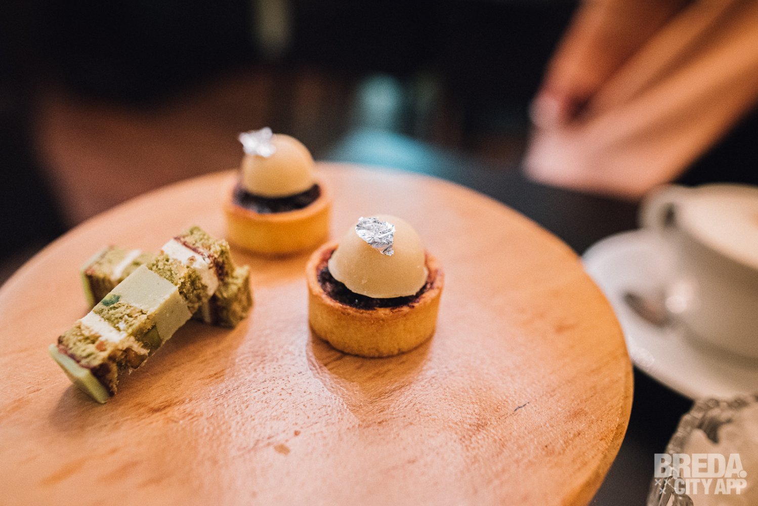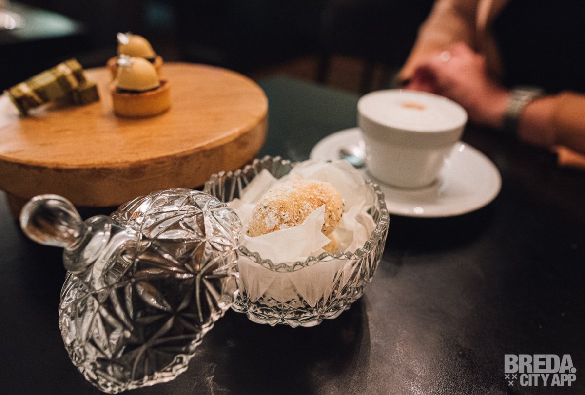 Nadat we hebben genoten van beide nagerechten komt Wendy bij ons aan tafel om te vragen of we koffie of thee na willen. We besluiten om nog even na te tafelen en bestellen allebei een cappuccino. De geur van verse koffie komt ons tegemoet en we worden verrast met de bijbehorende verschillende friandises. De friandises bestaan uit een Japanse beignet, een taartje van rozijn met butterscotch, miso en eetbaar zilver en een matcha cake met pistache.