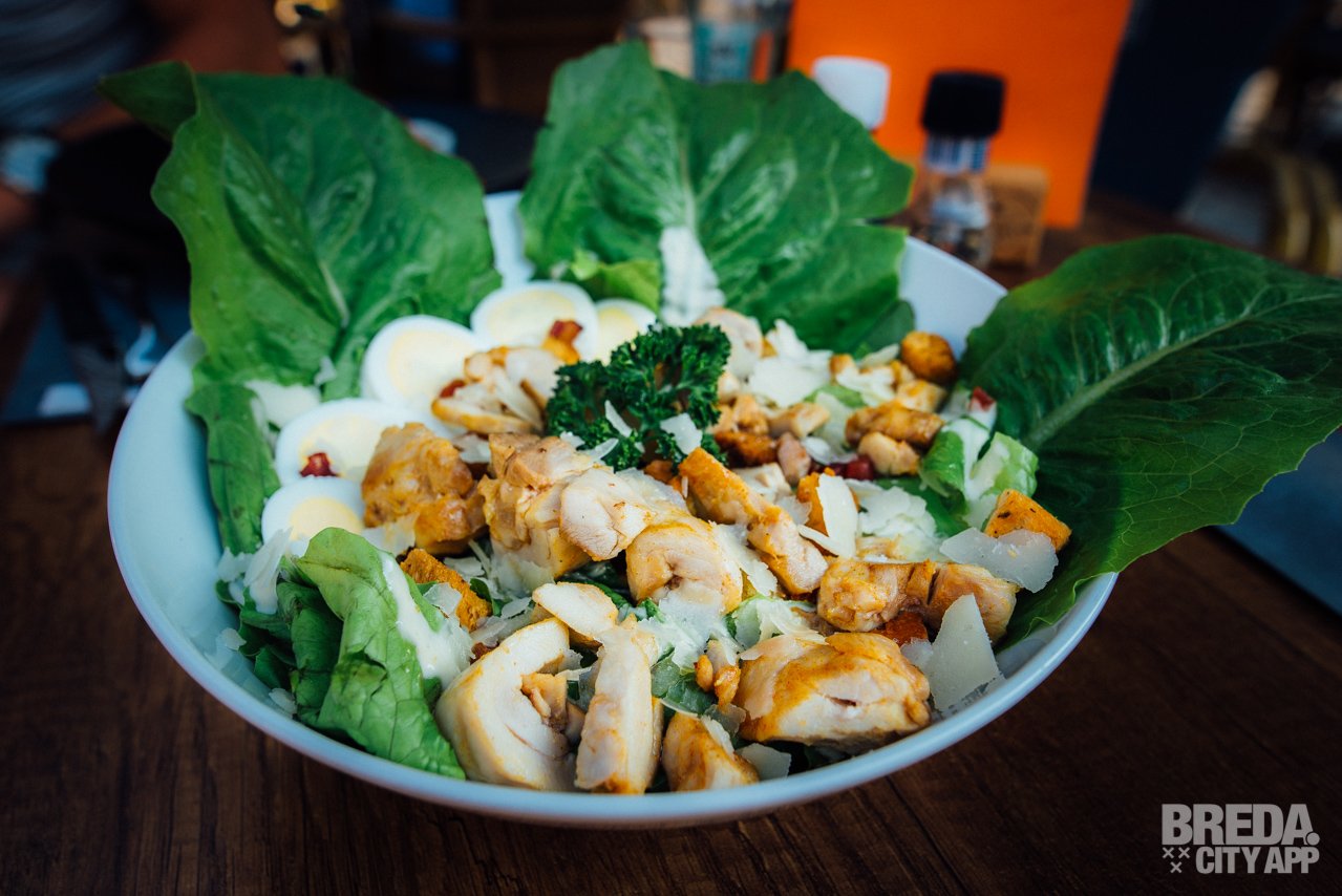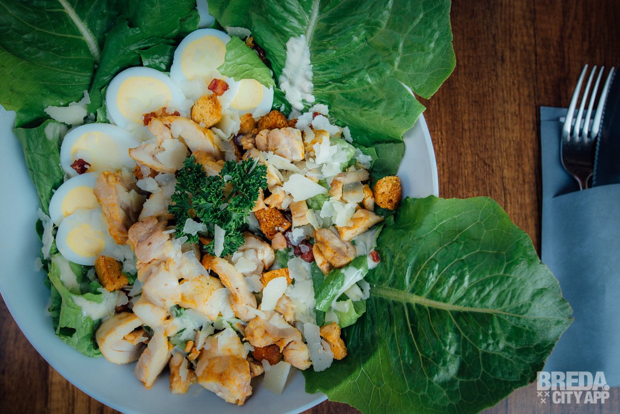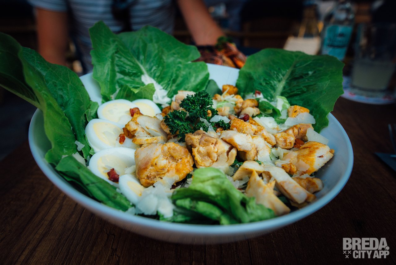 We kiezen met dit zomerse weer voor een frisse ceaser salade met Romeinse sla, ranch dressing, een gekookt eitje, spekjes en croutons. De hoeveelheid salade is ruim voldoende als avondmaaltijd en is afgemaakt met Parmezaanse kaas. Hoewel het eigenlijk niet nodig is, maar wel erg lekker (!), krijgen we hier ook wat frietjes bij. Smullen!