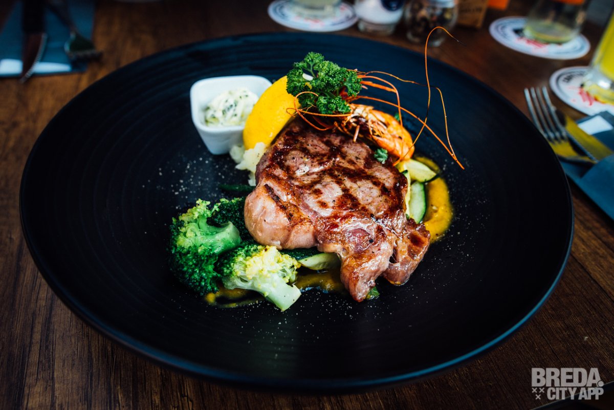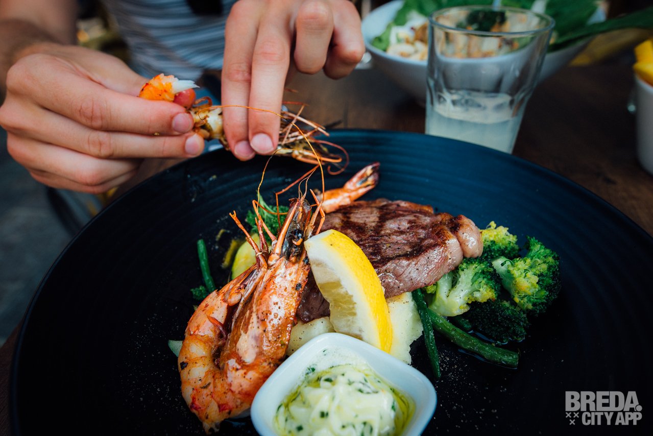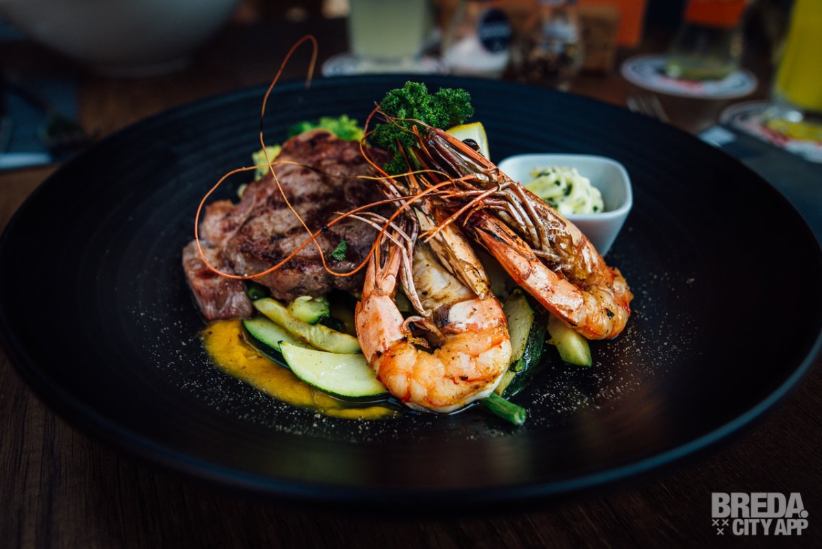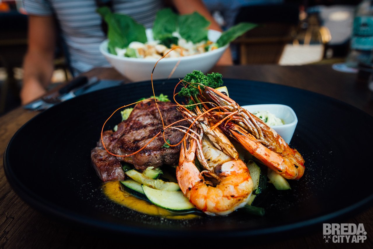 Bij mijn tafelgenoot loopt het water al in de mond bij het zien van het bord dat naast de salade op tafel verschijnt. De Surf & Turf ziet er niet alleen mooi uit, maar het ruikt ook al lekker.