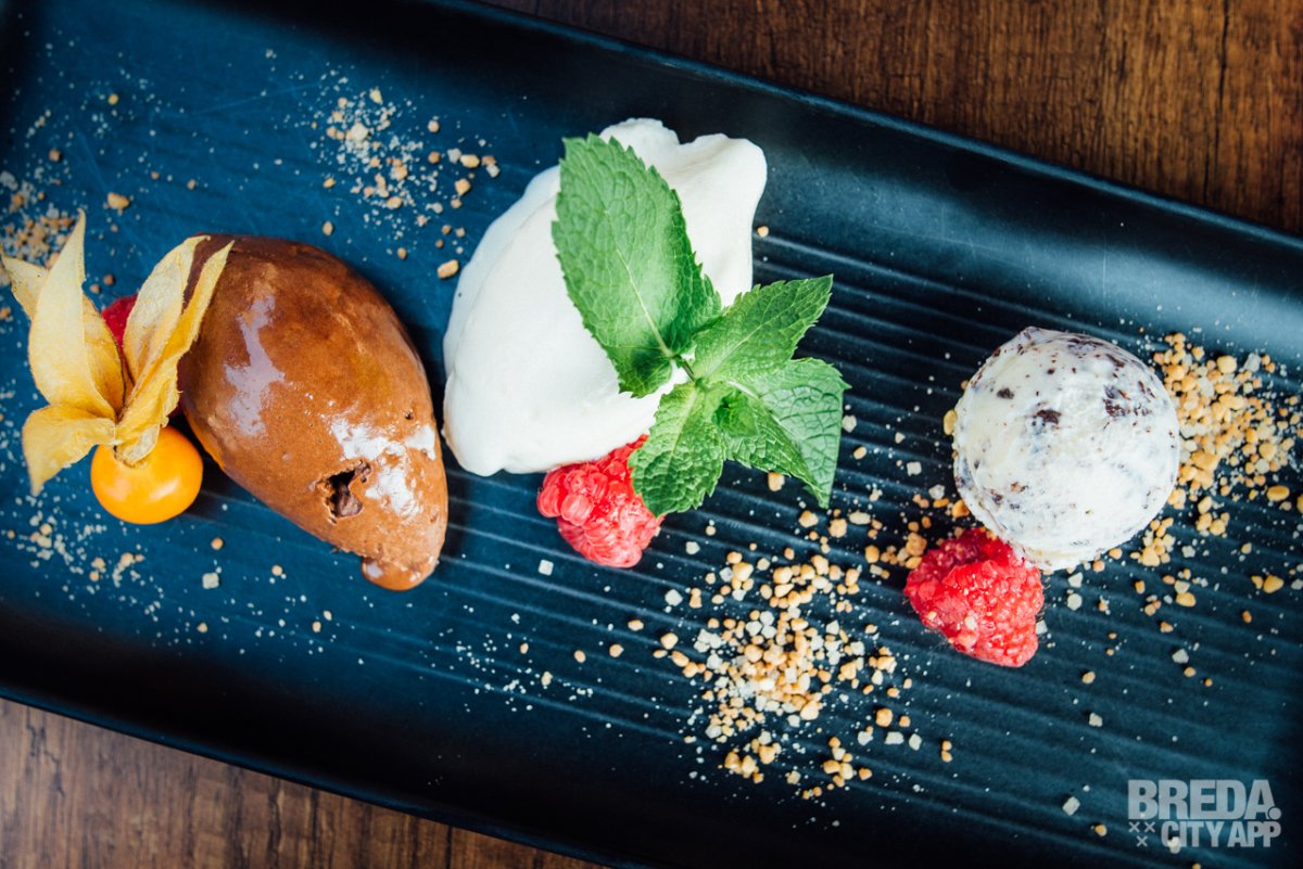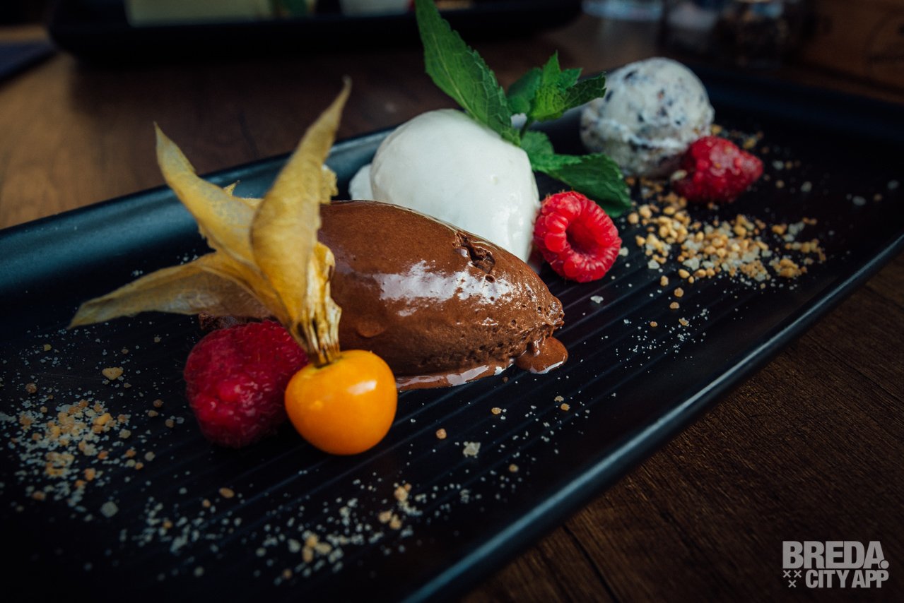 Het chocolade trio, bestaande uit stracciatella ijs, witte- en donkere chocolademousse is niet alleen schitterend opgemaakt, maar smaakt ook verrukkelijk!