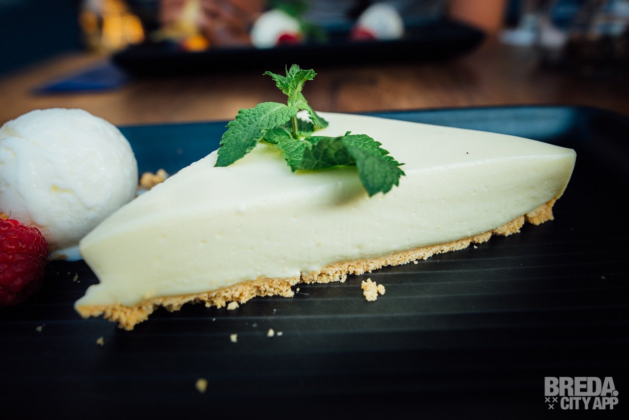 De passievrucht monchoutaart is heerlijk zomers! De taart (een aardig stuk is het!) is zoet en fris tegelijkertijd en de koekjesbodem is misschien nog wel het aller lekkerste van dit geheel! Bij dit nagerecht krijgen we tevens een zalig bolletje yoghurtijs en is het dessert afgewerkt met crumble, frambozen, munt en rozenbottel. Echt een aanrader!