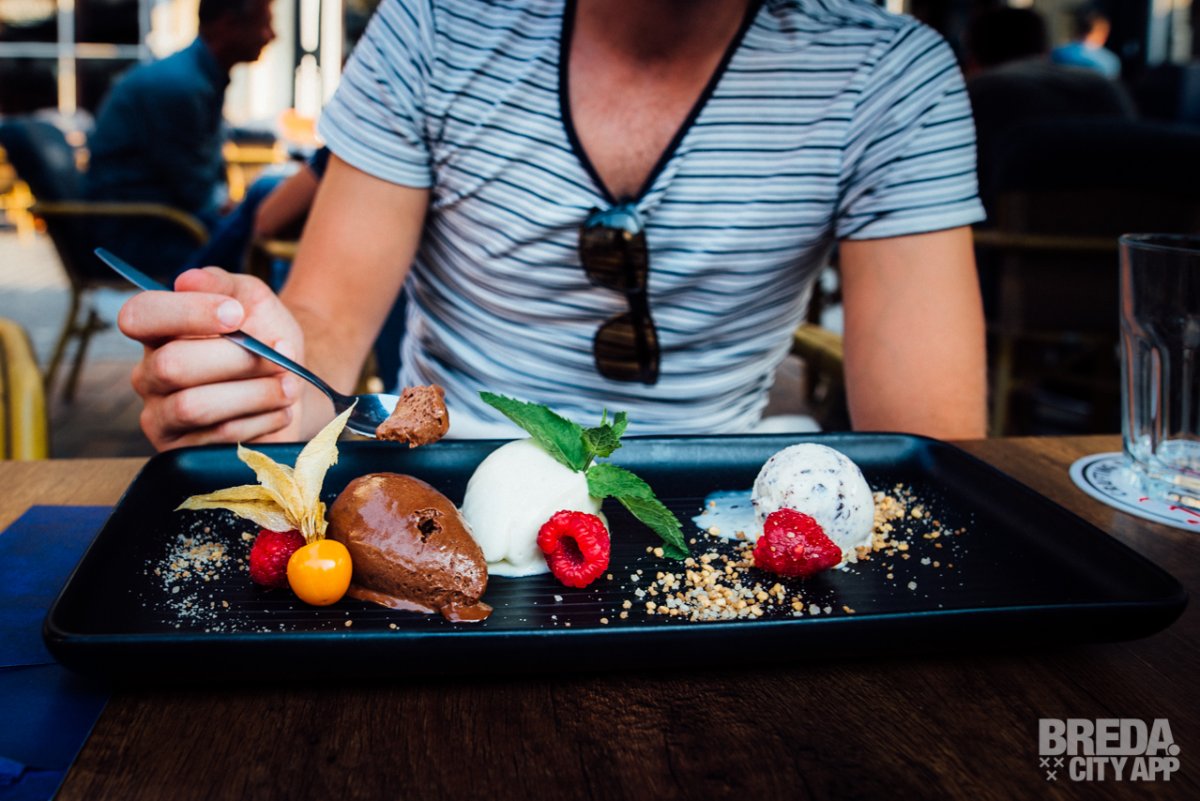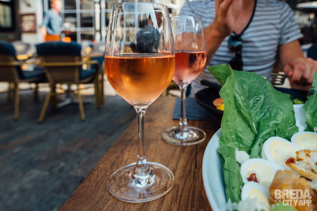 We worden vriendelijk welkom geheten en mogen een tafeltje uitkiezen op het sfeervolle en ruime terras aan een van de populairste pleinen van Breda. Het is dan ook al gezellig druk, hoewel het nog vroeg op de avond is, als wij plaatsnemen in de comfortabele stoelen onder de parasol en alvast een aperitief bestellen.