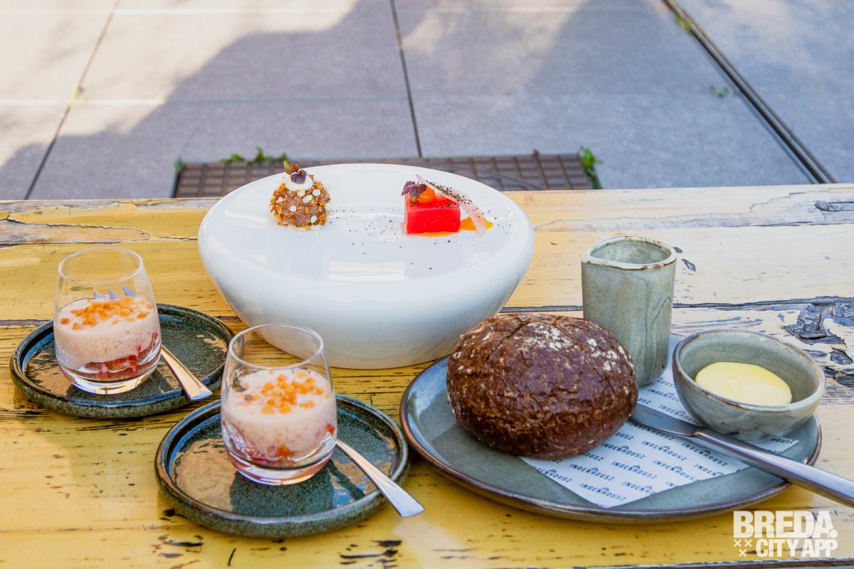 Als vegetariër kun je hier ook prima terecht, de chef houdt graag rekening met onze wensen. We krijgen daarom telkens twee verschillende gerechten. Als amuse beginnen we met een tartaarkogel met een crème van truffel en watermeloen met een crème van passievrucht en radijs. De aardse smaak van de radijs brengt de zoete toets van de watermeloen en passievrucht perfect in balans. Hiernaast krijgen we ook een combinatie van verschillende soorten bereidingen van tomaat, waaronder een schuim en salsa, met burratta.