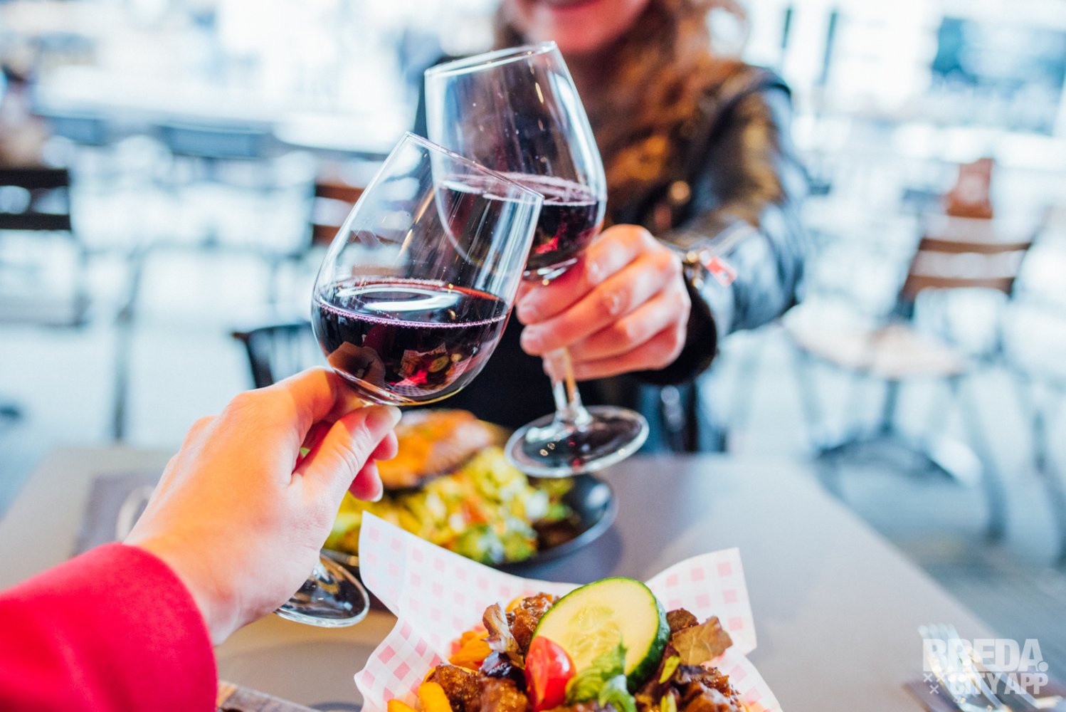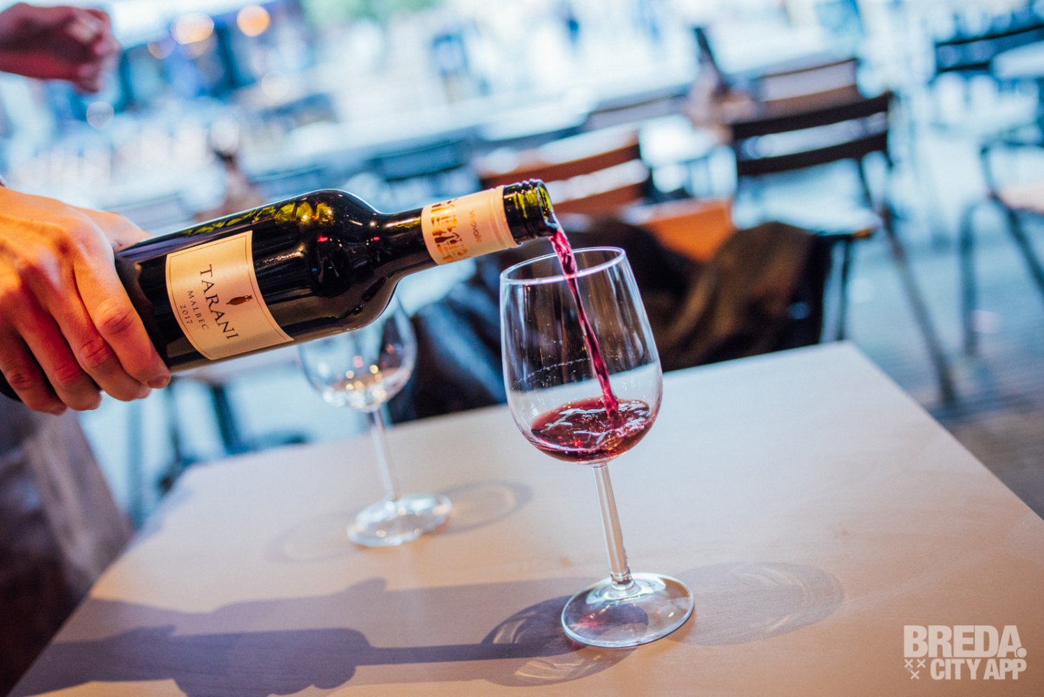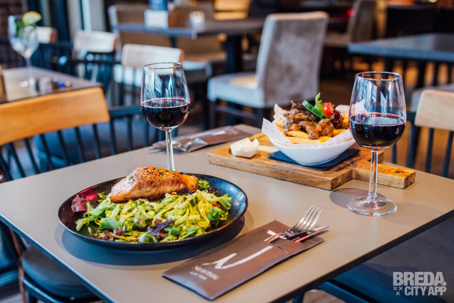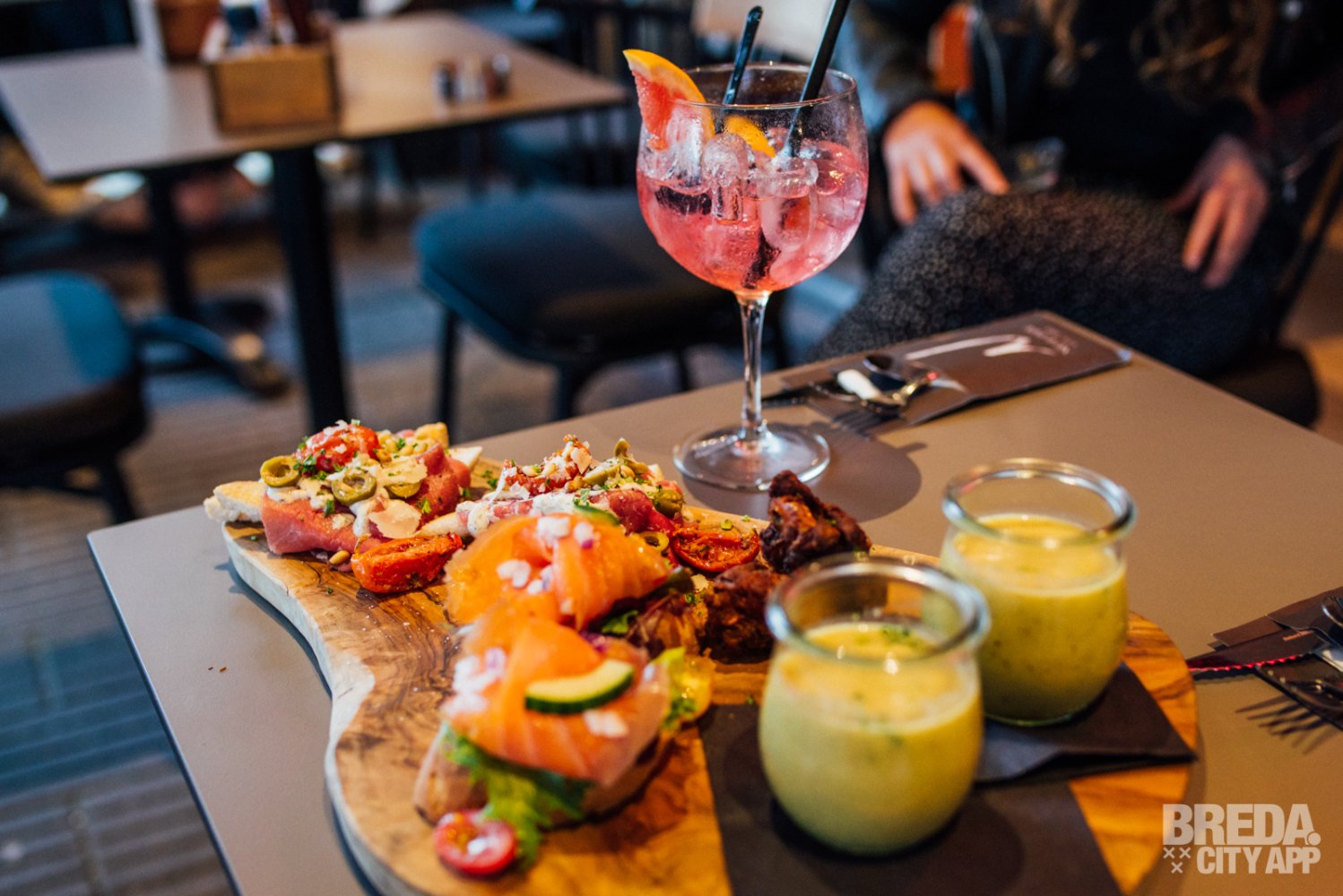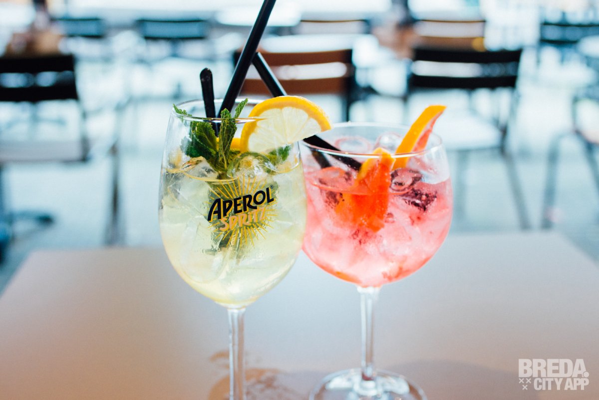 Het restaurant beschikt over een splinternieuw, modern terras waar je buiten in de zon kunt zitten. Waait het? Dan kunnen de zijkanten van het terras dicht, zodat je daar geen last van hebt. Is het een beetje fris? Dan kunnen de warmtelampen aan. Vandaag is het niet warm buiten en helaas een regenachtige dag, dus we nemen plaats aan een tafeltje onder de luifel. Door de warmtelampen hebben we nergens last van en genieten we van het uitzicht op Van Coothplein en het begin van de winkelstraat van Breda.