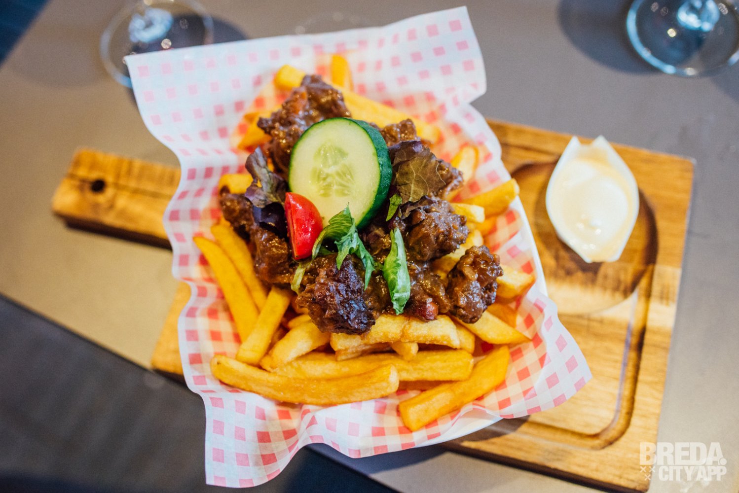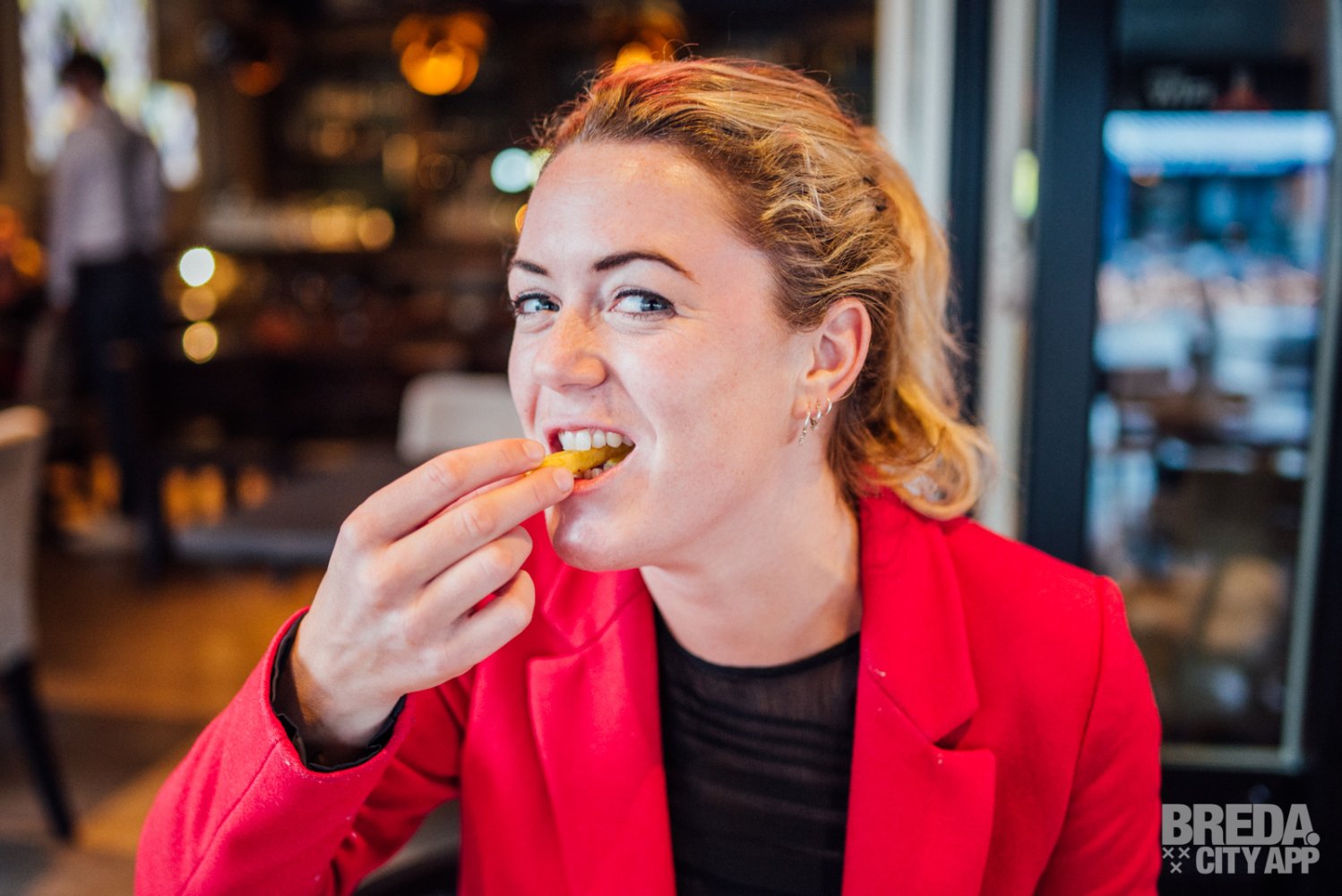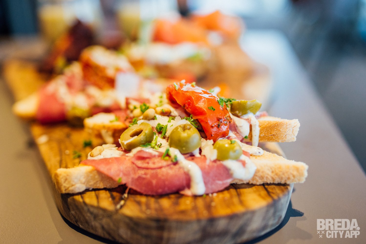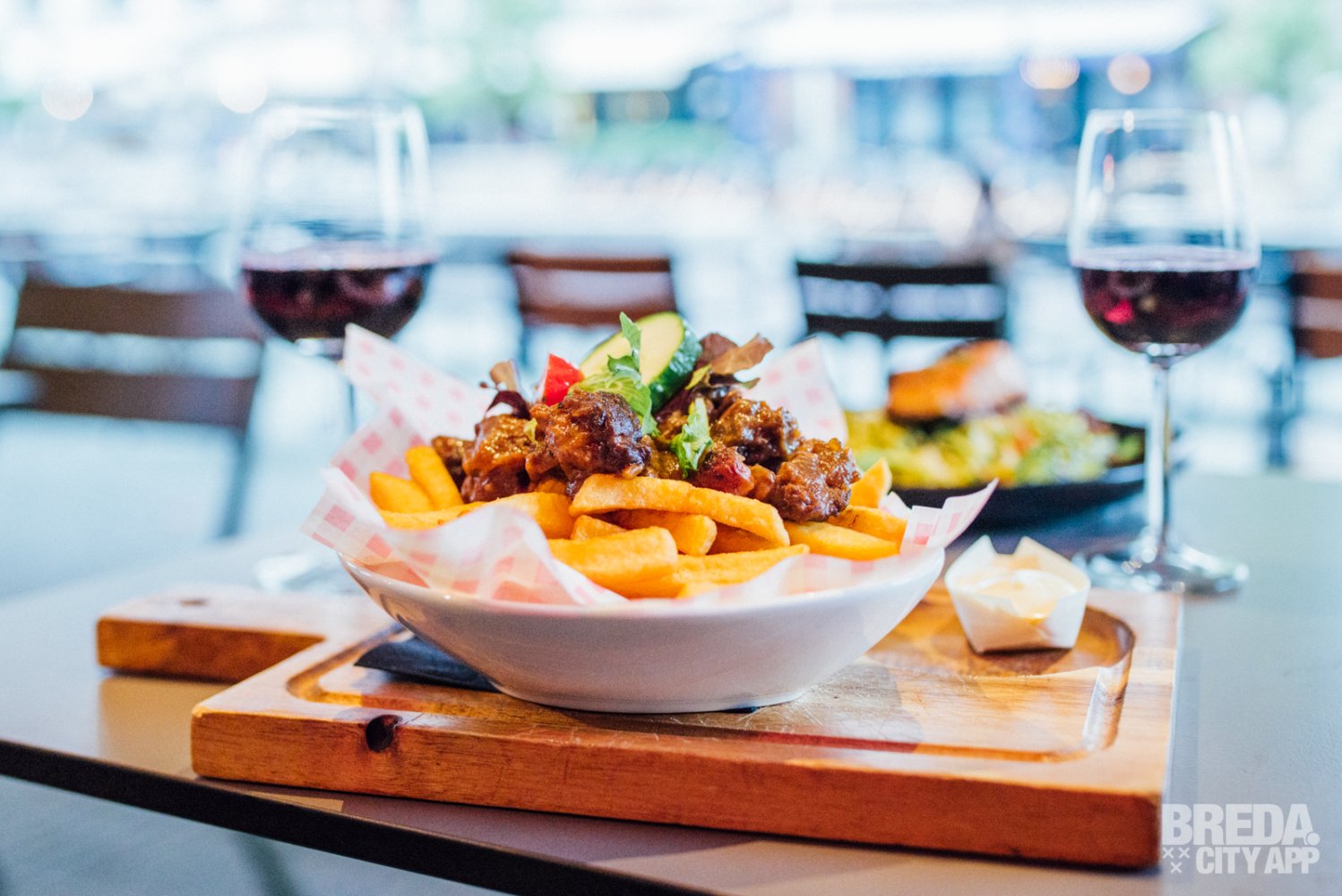 Het restaurant beschikt over een splinternieuw, modern terras waar je buiten in de zon kunt zitten. Waait het? Dan kunnen de zijkanten van het terras dicht, zodat je daar geen last van hebt. Is het een beetje fris? Dan kunnen de warmtelampen aan. Vandaag is het niet warm buiten en helaas een regenachtige dag, dus we nemen plaats aan een tafeltje onder de luifel. Door de warmtelampen hebben we nergens last van en genieten we van het uitzicht op Van Coothplein en het begin van de winkelstraat van Breda.