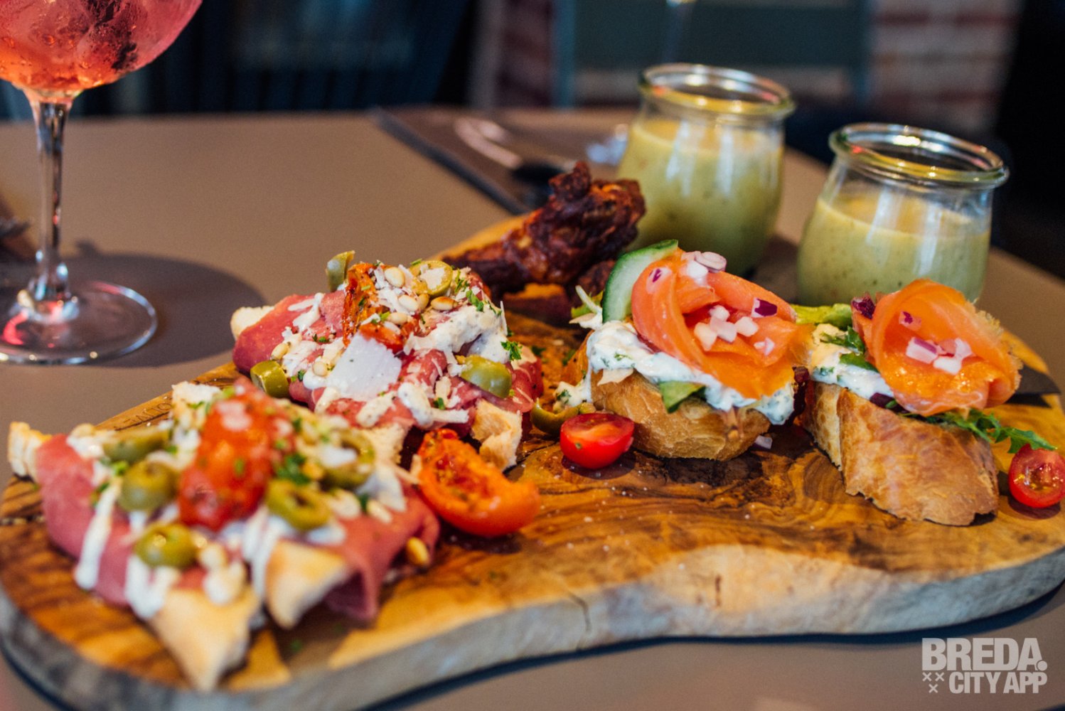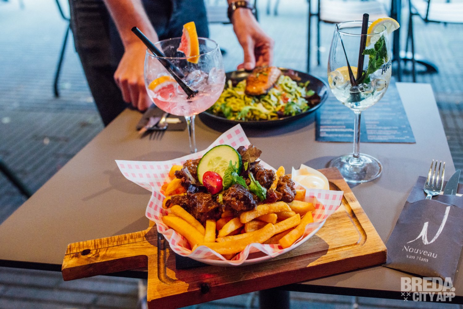 Op de borrelkaart van Nouveau van Ham vind je diverse hapjes. Van nacho’s uit de oven, tot een vegetarische borrelplank, bittergarnituur, een hollandse plank en een combinatie van de borrelkaart. We zijn nieuwsgierig en kunnen niet kiezen, dus het wordt een combinatie van de borrelkaart.
