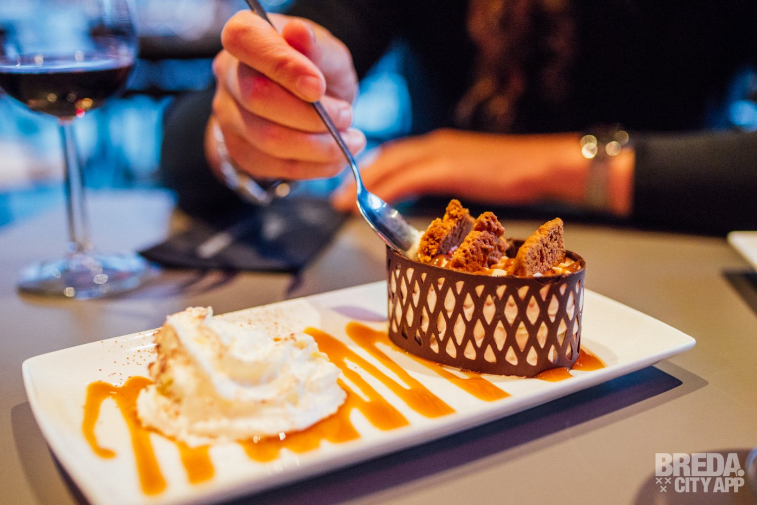 Wanneer je twijfelt of je nog een dessert wilt eten, word je door de kaart van Nouveau van Ham behoorlijk verleid. Tartufo van nougat, roomijs en nougatine? Of misschien roodfruit met fruitige saus, verpakt in vanillemarsepein? Klinkt ook lekker, maar wij gingen toch voor de caramel roomijs met stukjes bastognekoek in een chocoladenestje. Dat was heerlijk zeg. We genieten na met een kopje koffie en bedanken het erg vriendelijke, behulpzame personeel en eigenaresse Kelly. Dineren bij Nouveau van Ham was zeker niet onze laatste keer!