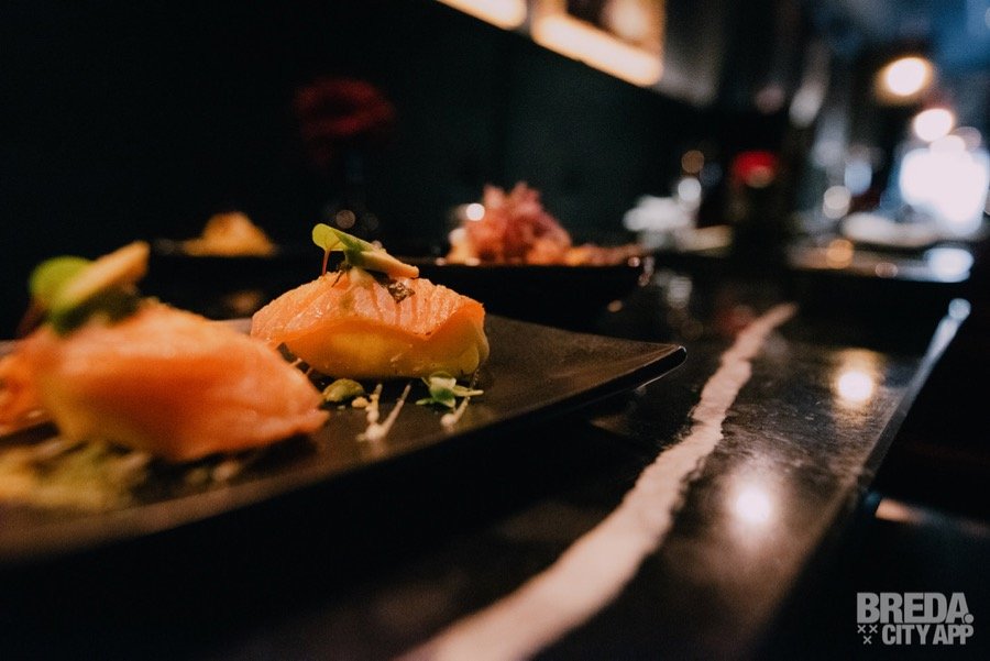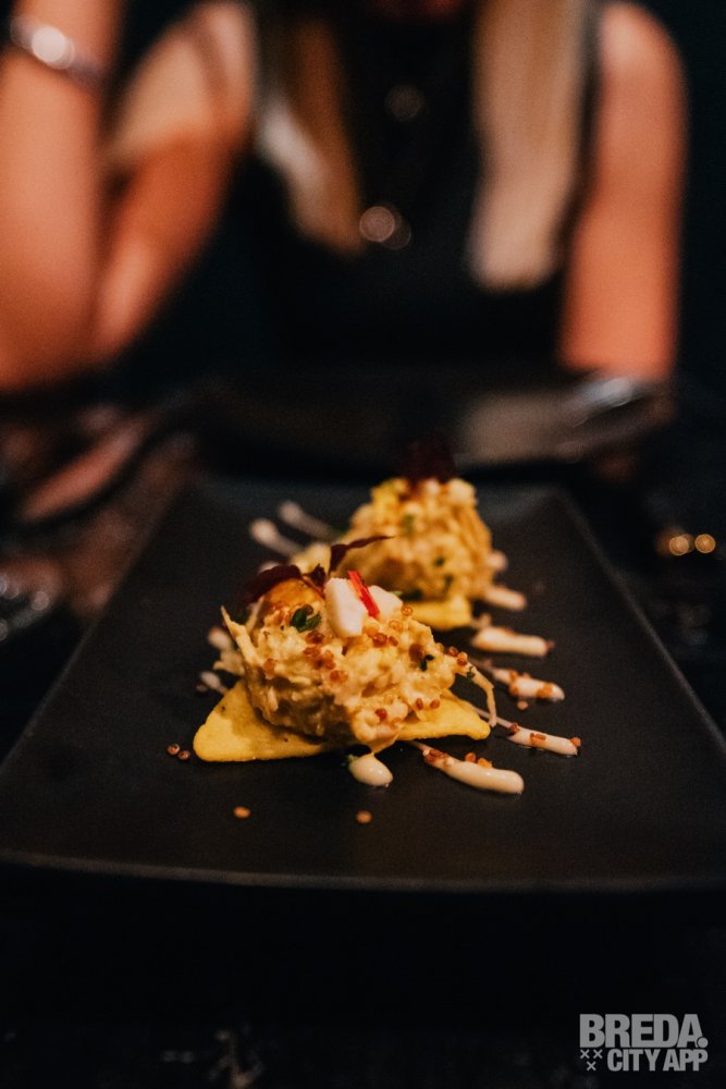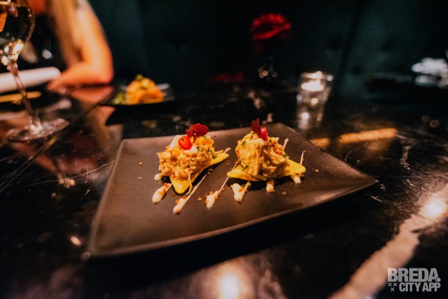 Wat een verrassingen komen er in de eerste gang op tafel. We zien drie mooie schilderijtjes van eten om te delen en worden duidelijk geïnformeerd over wat we voor ons hebben liggen. We beginnen met iets dat lijkt op een nigiri zalm uit de sushi wereld: ‘Causa gerookte zalm’. Het is een aardappeltaartje met avocado, zalm en limoenmayonaise en voelt heerlijk zacht in de mond. Het aardappeltaartje is pittig gekruid en is daardoor met de limoenmayonaise een heerlijke combinatie. Vervolgens nemen we een hapje van de Peruaanse klassieker: ‘Ceviche’. Op de kaart heet dit gerecht ‘Ceviche Nikkei’ en het is dit keer gemaakt van verse tonijn, rode ui, nori, nanami togarashi, sesam, gegaard in limoensap met leche de tigre (soja saus) en cancha (mais). Heerlijk zacht, mals en friszuur in de mond en het leuke is dat de chef zo nu en dan van vissoort wisselt. Surprise surprise dus! Vervolgens nemen we het mais krokantje tot ons, wat je in Peru ‘Aji de Gallina’ noemt. Het is gevuld met geplukte kip, gele peper en maakt deze eerste, feestelijke gang helemaal af! Het bijpassende glas Pinot Grigio is trouwens ook écht heel erg lekker, toegankelijk en toch vol van smaak.