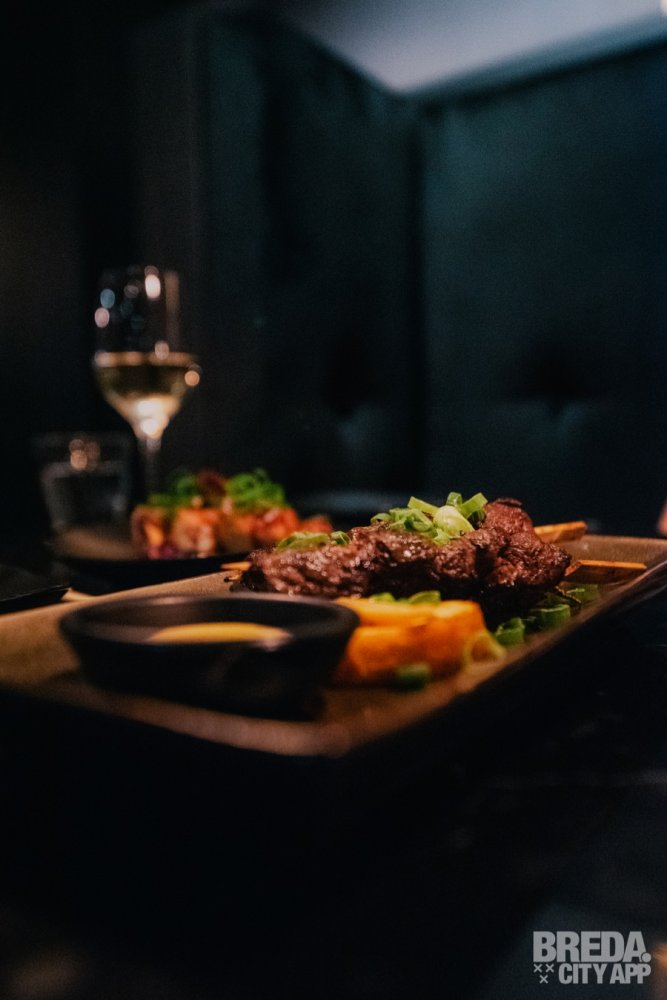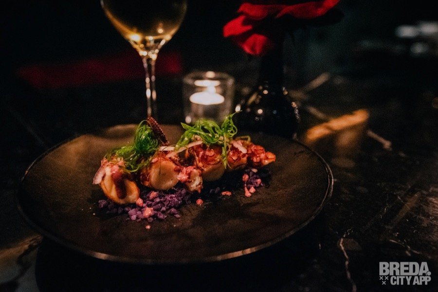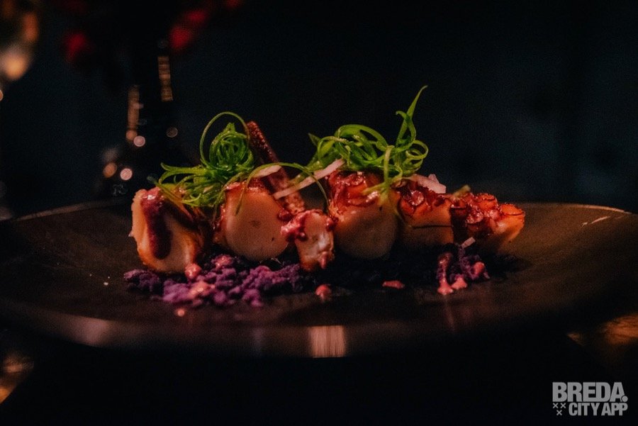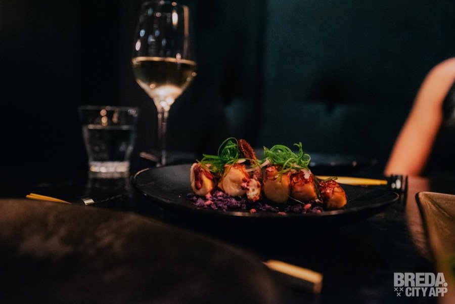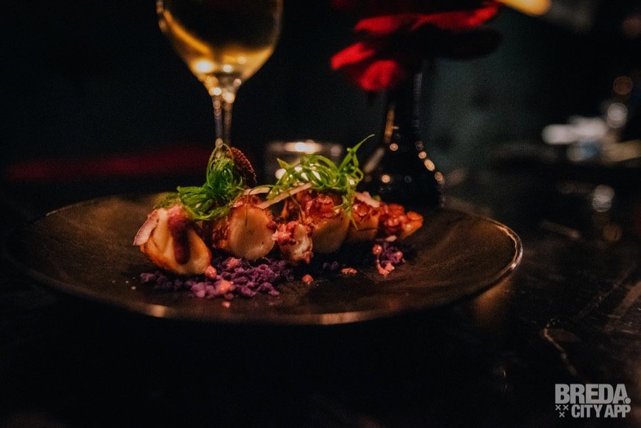 ‘Pulpo al Olivo’ is geserveerd met een olijven emulsie, gekookte truffelaardappeltjes en bosui. Met de bijpassende wijn, een Grüner Veltliner, zijn we wederom aan het genieten. De porties zijn ook echt om te delen en het is fijn dat er nog ruimte is voor de derde gang. Die willen we namelijk ook echt niet missen…