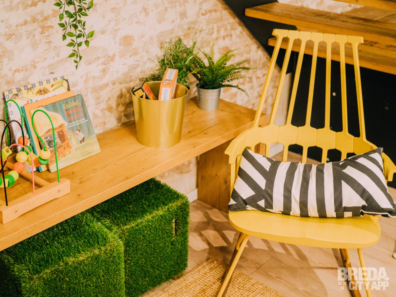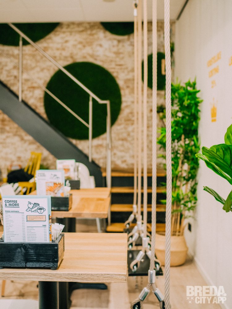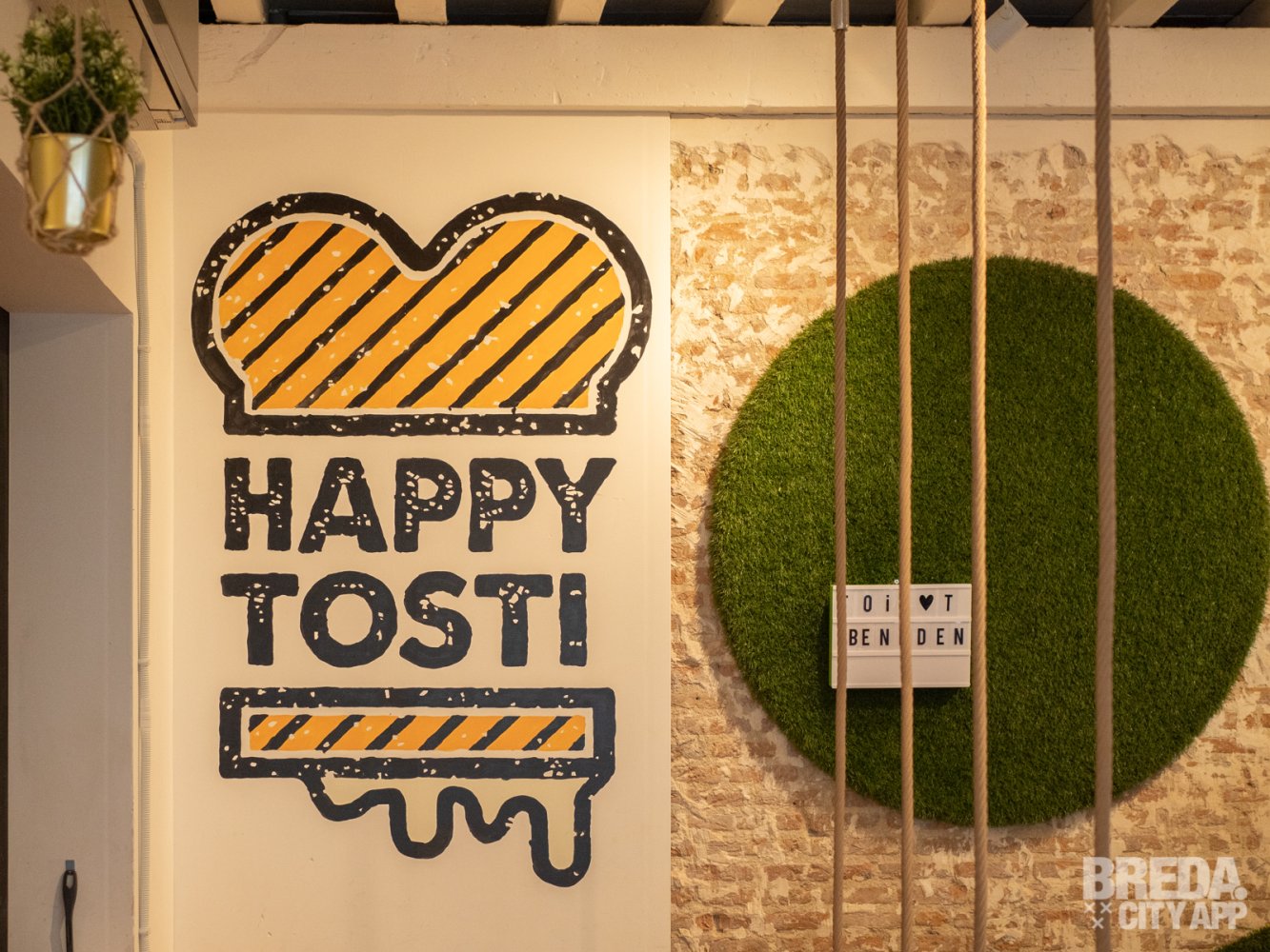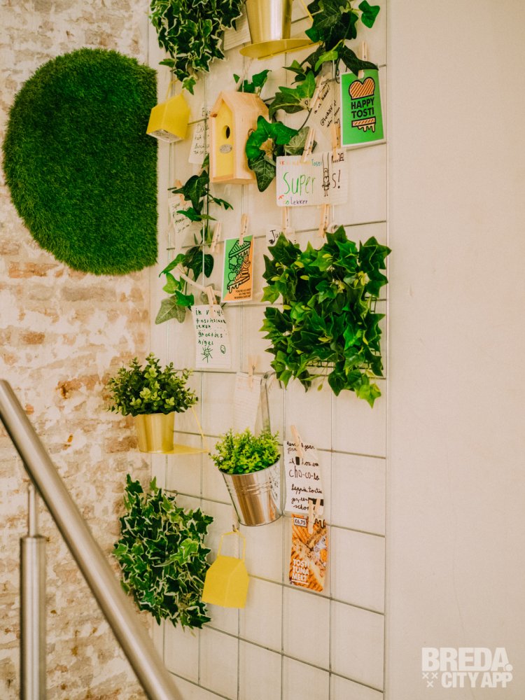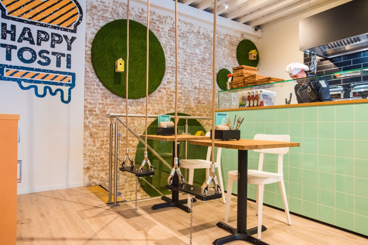 We nemen plaats aan een tafeltje in de tostikelder. Happy Tosti is een knus zaakje met twee verdiepingen. De onderste verdieping wordt de tostikelder genoemd. Het bijzondere interieur valt gelijk op zodra je binnenloopt. Op sommige plekken staan er geen stoelen maar hangen er schommels. Verder is de zaak een bonte verzameling van kleurrijke schilderijen, muurschilderingen, knalgele industriële lampen en planten. Aan gezelligheid is er geen gebrek!