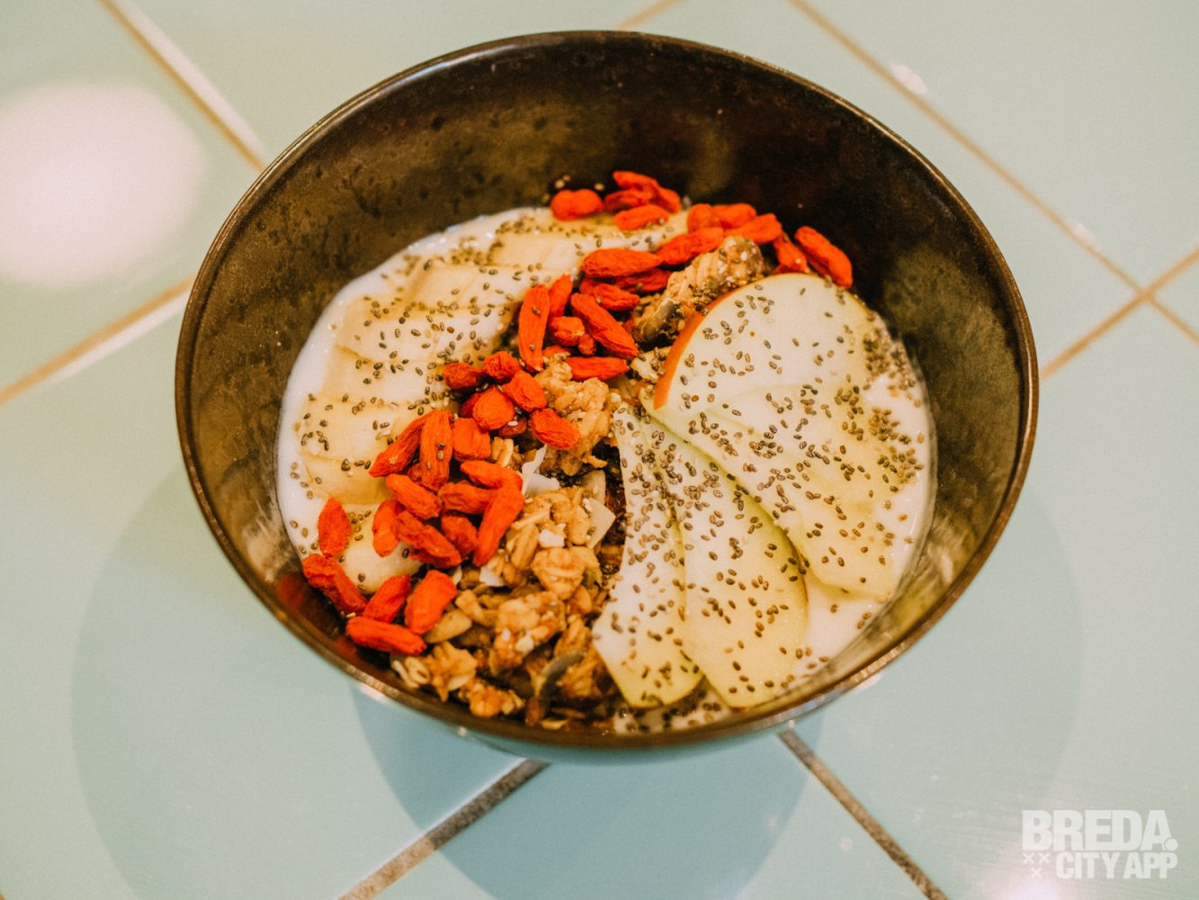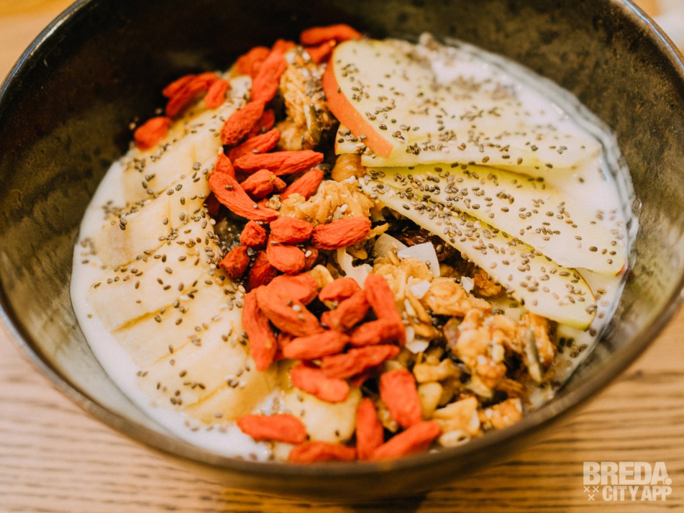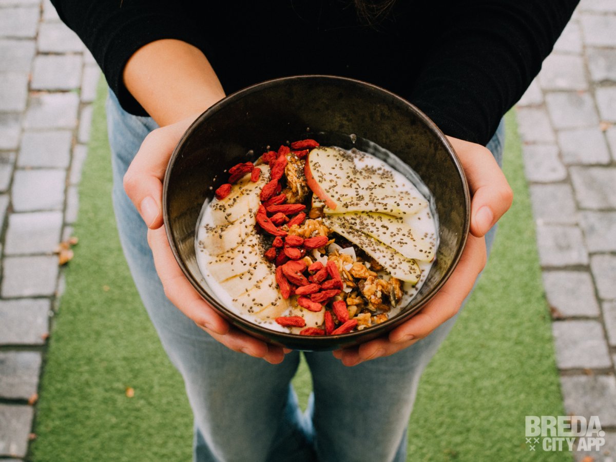 Ook bestellen we een luxe yoghurtbowl met granola, banaan, appel, chiazaad en gojibessen. Je kunt kiezen uit de smaken naturel, cacao en matcha. Ideaal als je liever een gezond ontbijt hebt.