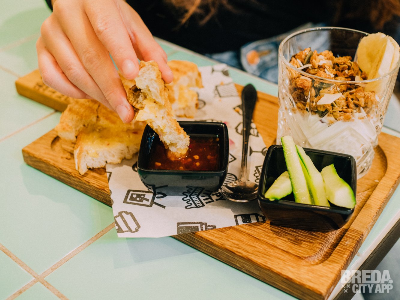 Wij kiezen voor een groene thee en een cheesy tosti op witbrood. Dit is een tosti met gruyère kaas, belegen bio kaas, cheddar kaas en gesnipperde ui. Daarnaast krijg je de keuze uit verschillende sauzen van truffelmayonaise tot hummus, wij gaan voor een lekkere chilisaus op aanraden van het personeel.
