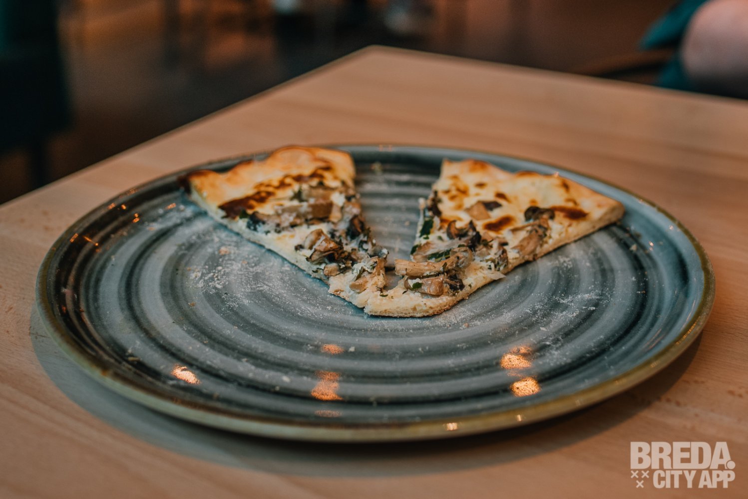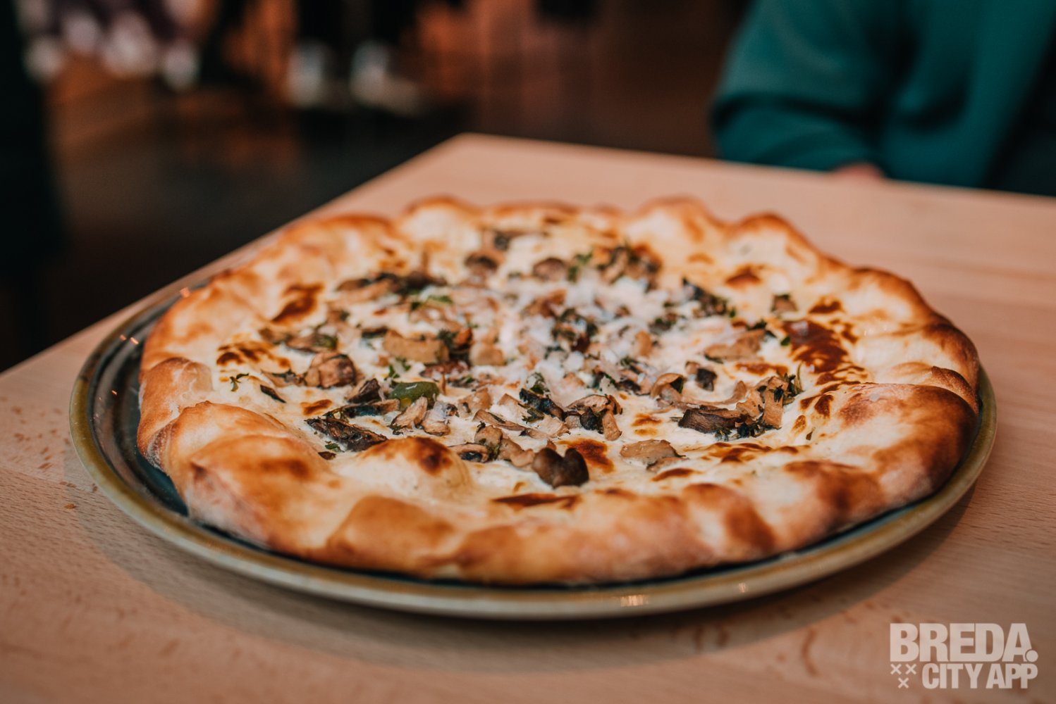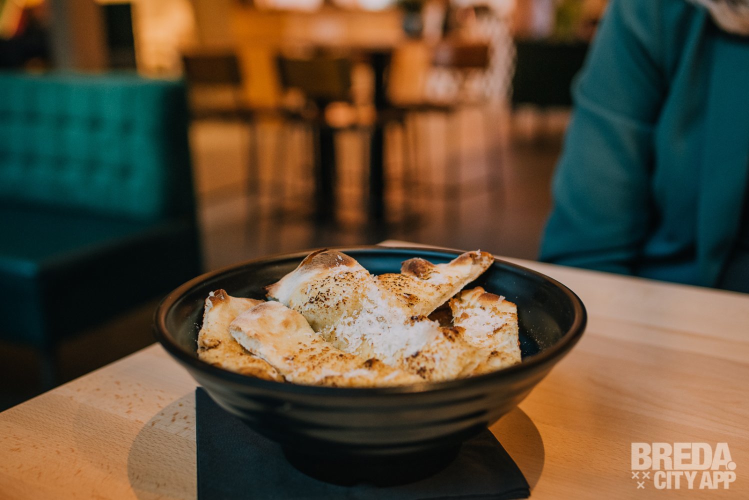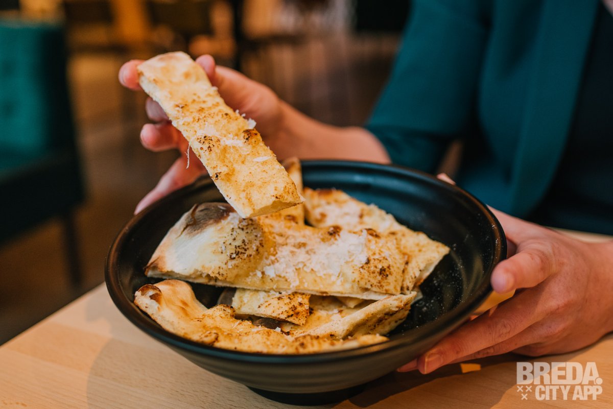 Inmiddels hebben wij flink trek gekregen! We starten vandaag met Garlic Bread en een drankje vooraf. We nemen hiervoor plaats in de hip ingerichte industriële ruimte. We worden snel geholpen door het bedienend personeel van de grote gezamenlijke bar in het midden van het pand. Binnen enkele minuten is ons voorgerecht klaar, welke we zelf kunnen ophalen. Het Garlic Bread is gemaakt van pizzadeeg met verse knoflookolie, Parmezaanse kaas en zeezout. Je proeft dat deze lekker knapperig is afgebakken onder de pizzaoven. Dit smaakt naar meer!