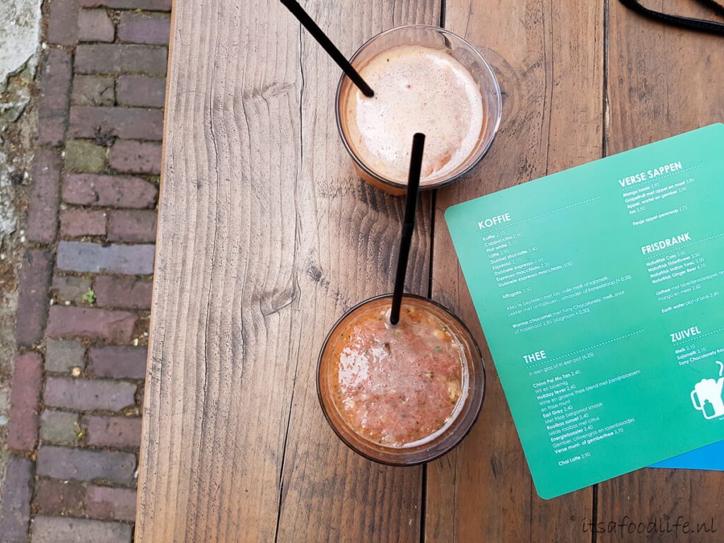 De drankenkaart is eigenlijk redelijk uitgebreid. Warme dranken zoals verschillende soorten koffie, warme chocolademelk met Tony Chocolonely (ga ik in de winter proberen) en verschillende soorten thee per glas of pot te bestellen.