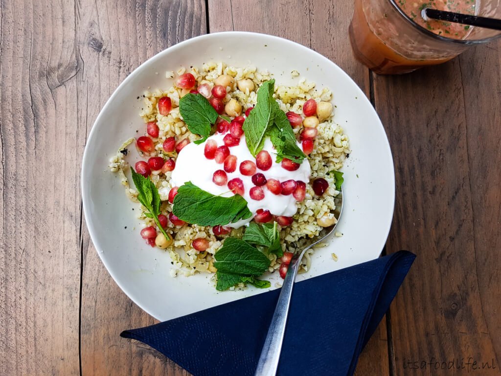 Van de ‘warme kaart’ hebben wij ons gerecht besteld: bulgursalade met Griekse yoghurt, kikkererwten, gebakken ui, granaatappel, komijn en munt voor 8,50 euro. Het duurde weer even voordat de salade werd geserveerd maar we zaten toch lekker te kletsen dus dat gaf niet. Het smaakte goed en lekker, maar niet bijzonder. Iets wat je thuis binnen 10 minuten in elkaar zet zeg maar. En het was ook niet bepaald veel dus dat was een beetje een teleurstelling maar misschien komt dat ook omdat we vrij hongerig waren ;). Máár ik zou het dus binnenkort wel thuis eens willen na-fabriceren omdat het wel lekker en zomers was.