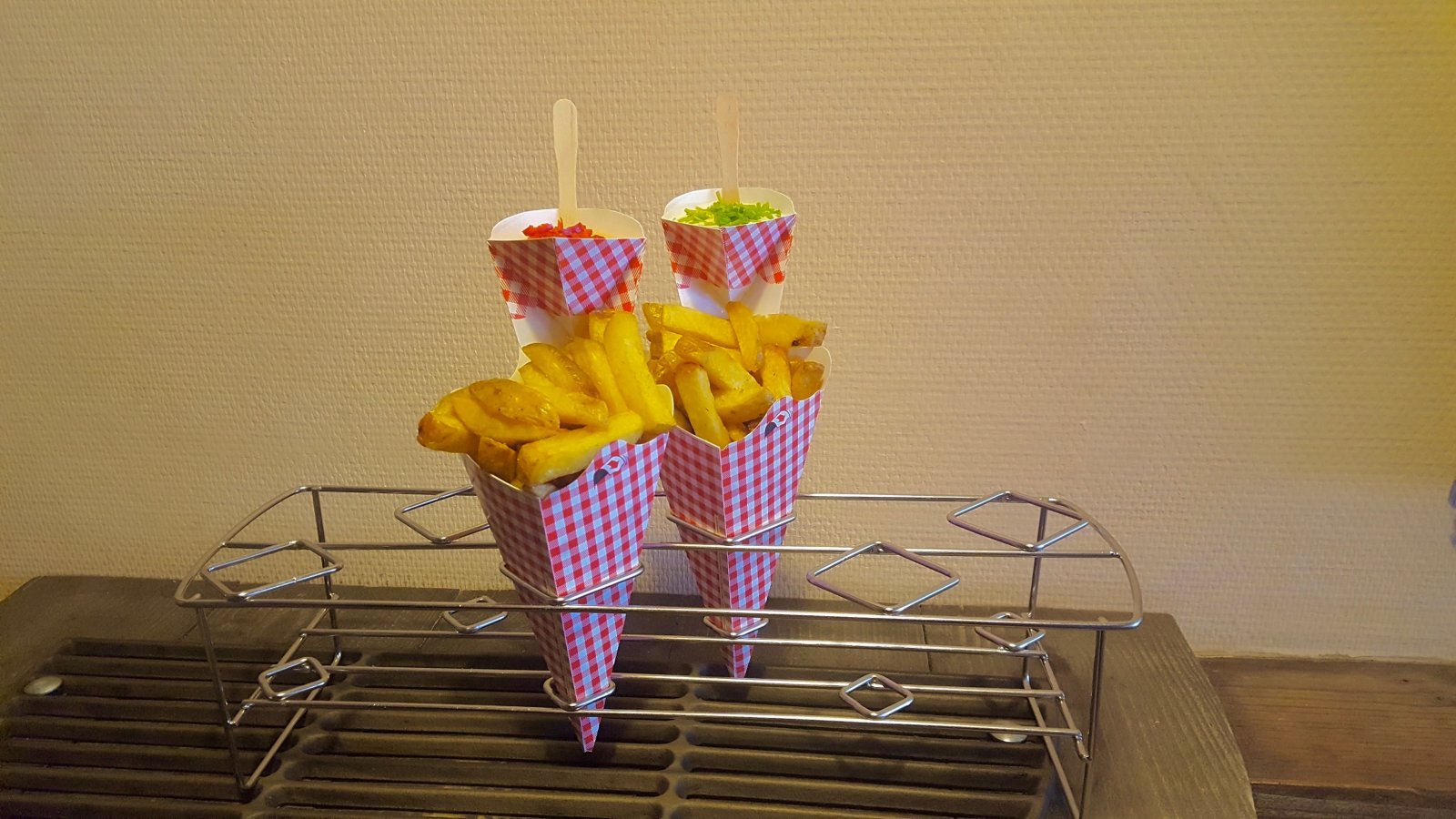 De frieten worden gepresenteerd in een mooie klassieke frietzak met een moderne twist, de saus wordt los gepresenteerd wat als voordeel heeft dat je friet niet begraven ligt onder de saus.