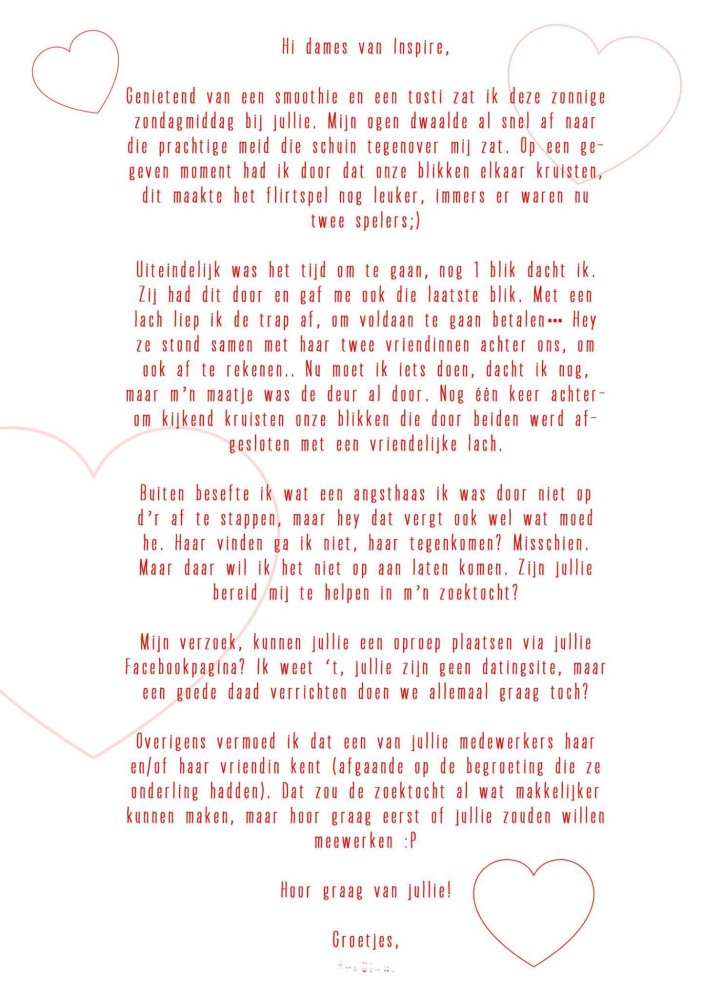 Test site Nieuws Scoops Love is in the air Delen Facebook Twitter Google+ Love is in the air Geplaatst op 26 maart 2015 De zomertijd gaat bijna in en dan krijgen we natuurlijk weer lentekriebels... Bij Inspire Coffee was dat al goed te merken, ze kregen namelijk onderstaande brief van een gast. Help deze jongen en deel het bericht! #LoveIsInTheAir