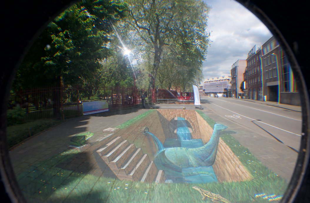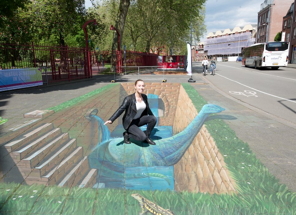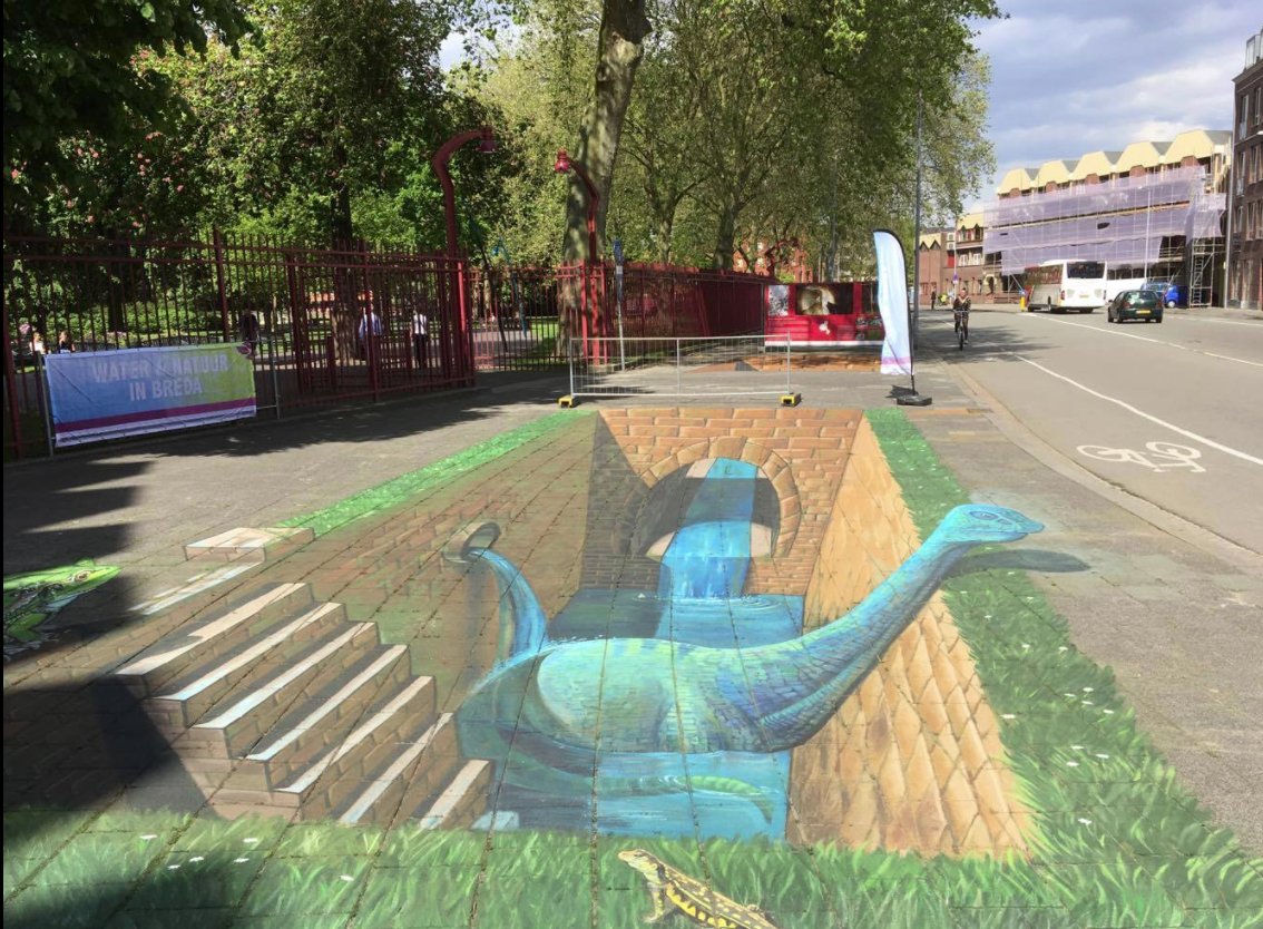 De grote 3D tekening van het blauwe beest in het riool langs het Valkenbergpark is de komende weken te zien en moet dragen bij aan de bewustwording en is onderdeel van de activiteiten rondom 'de Week van Ons Water'.