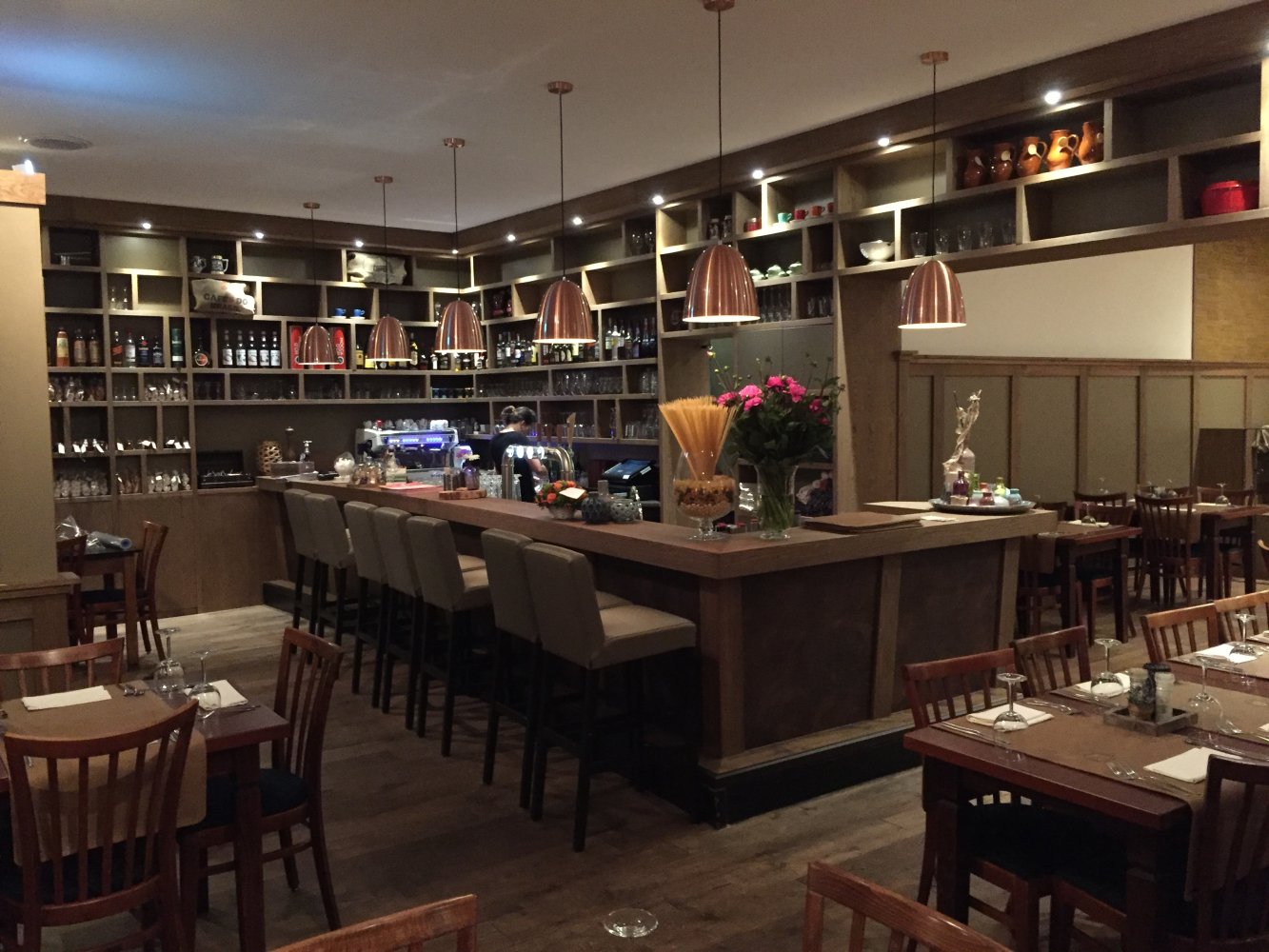 Het restaurant heeft een totale make-over en een fijne frisse nieuwe uitstraling gekregen. Er is aan ieder hoekje veel aandacht besteed om het speciaal te maken. De bar lijkt door alle producten die zij presenteren haast op een kruidenierswinkel. Hier kun je nu zelfs eten door de luxe barkrukken. Op het oude podium staan prachtige wijnrekken voor de openslaande vide-deuren die leiden naar het achterste gedeelte van het restaurant. Daar stap je in een bibliotheek van kookboeken en historie van vroegere tijden. Veel hout en lichte kleuren sieren de Egelantier.