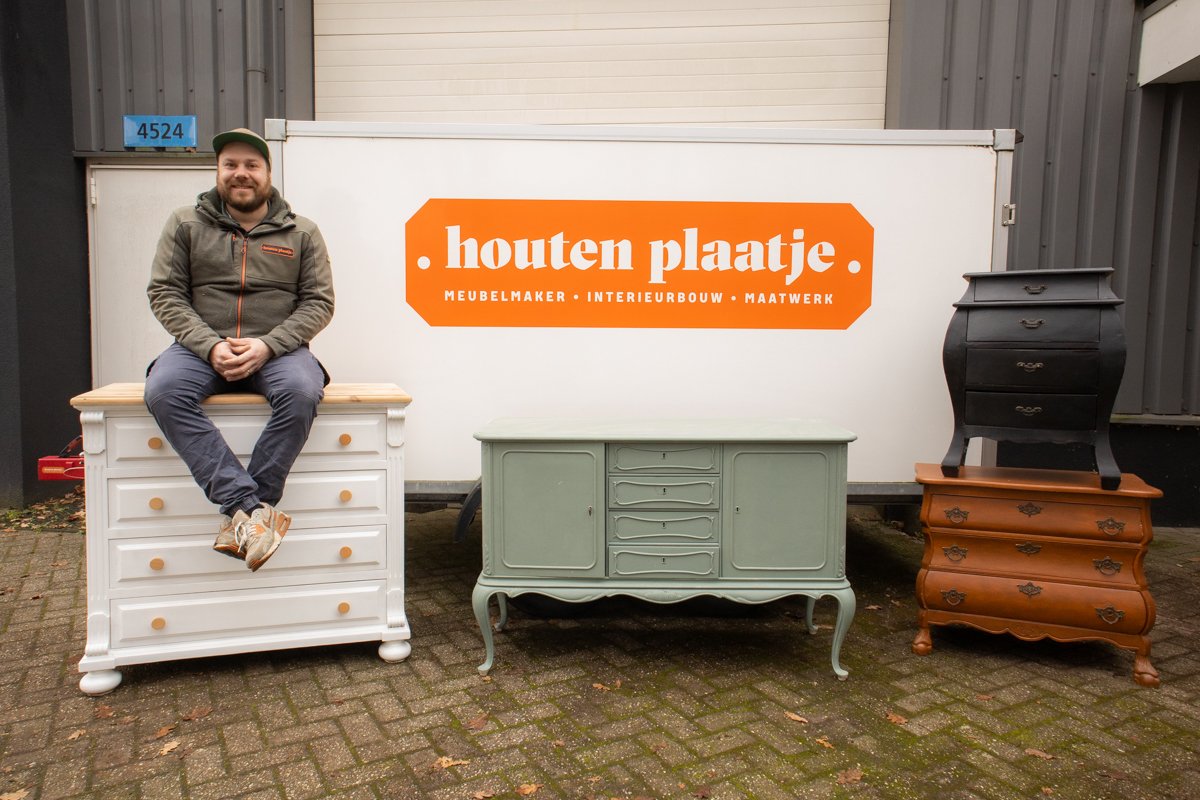 Naast het maken van nieuwe meubels, blazen ze bij Houten Plaatje ook vintage meubels nieuw leven in. Oude kasten en stoelen worden zorgvuldig opgeknapt en krijgen een eigentijdse uitstraling, zonder hun karakter te verliezen. Zo combineren ze ambacht, duurzaamheid en hergebruik op een unieke manier.